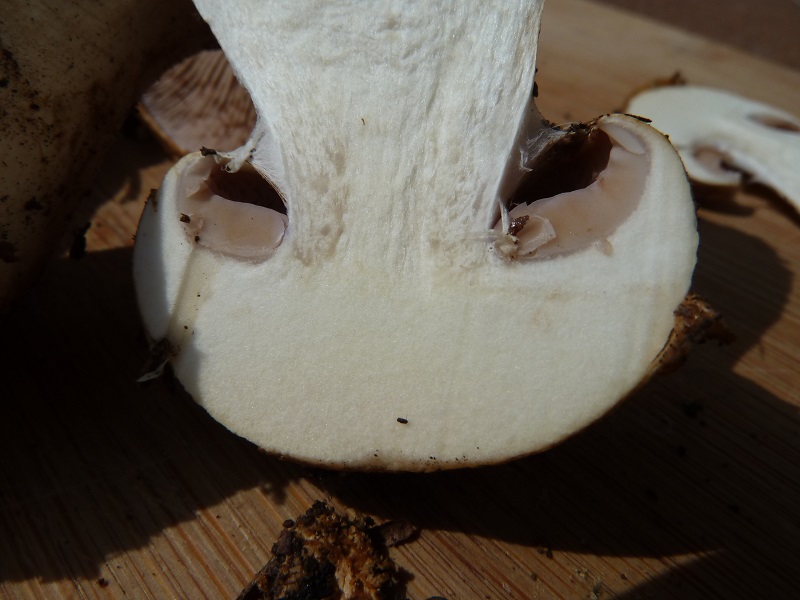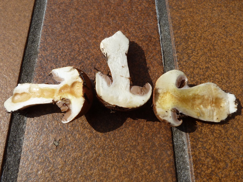 generell würde ich unbekannte Pilze zum Bestimmen nicht abschneiden, sondern vorsichtig herausdrehen. Je nach Gattung gehen dir sonst wichtige Merkmale flöten. Dann am unverletzten Pilz riechen und erst danach schneiden, reiben, kratzen und ähnliche Verletzungen hervorrufen, durch die Gerüche und Verfärbungen entstehen oder verstärkt werden.
