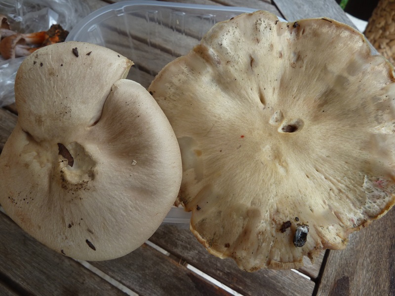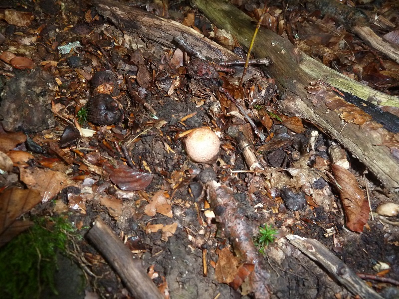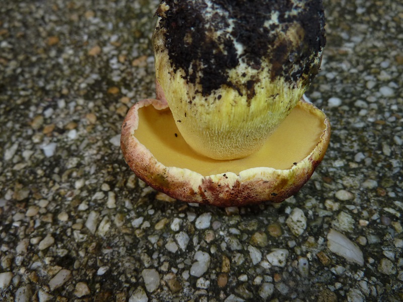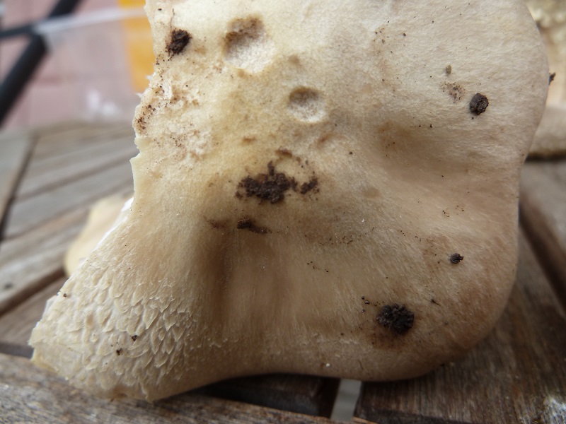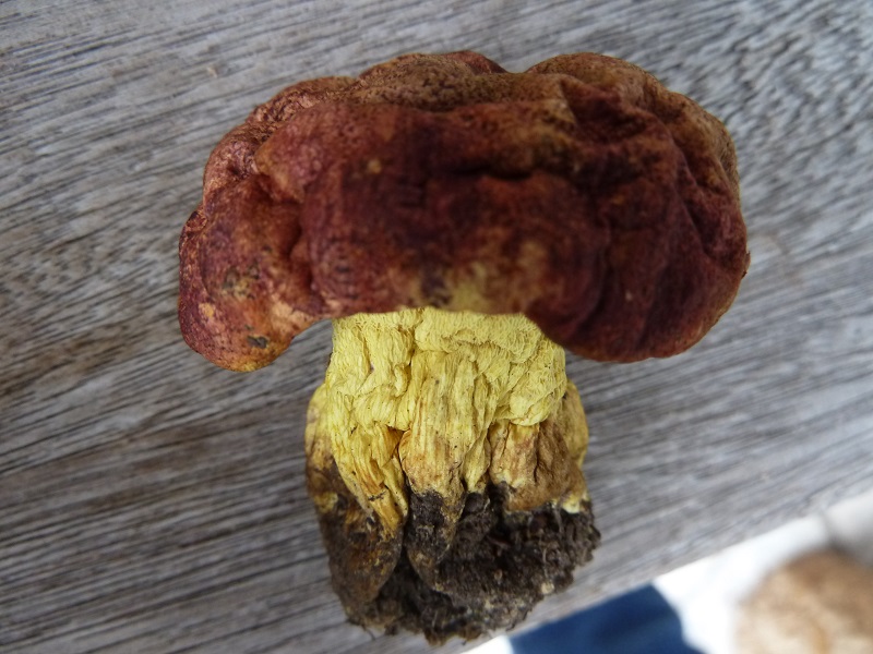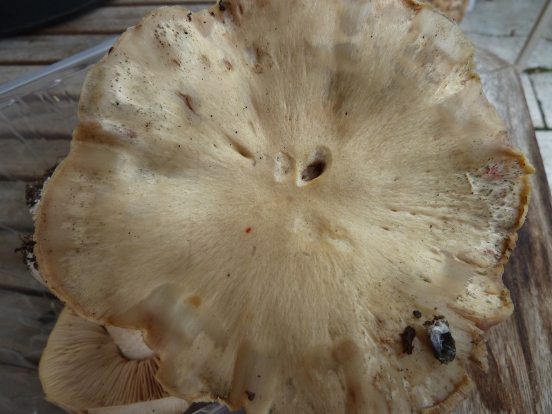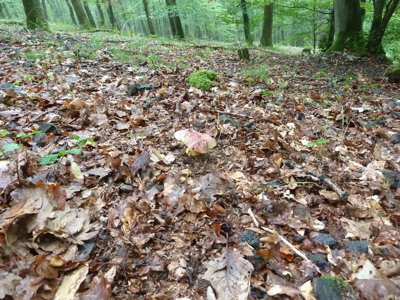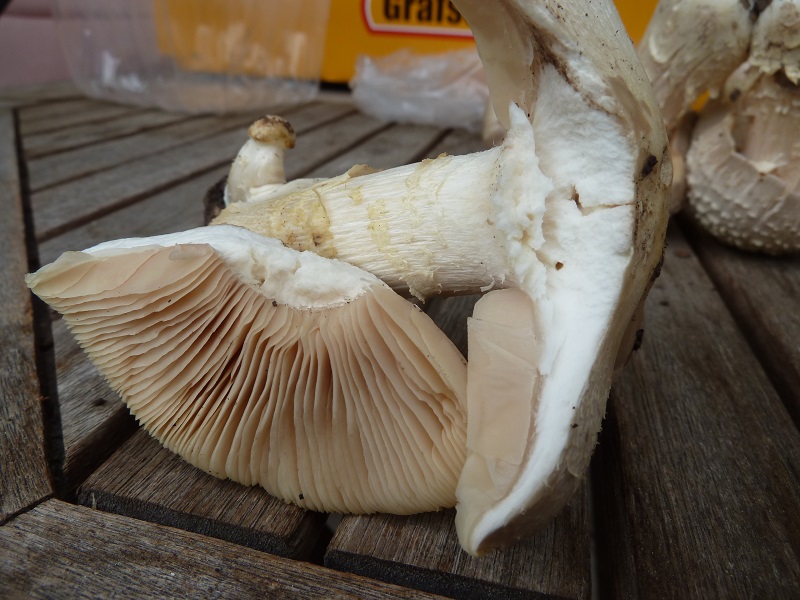 Darauf habe ich leider nicht geachtet. Ich schneide normalerweise erst einen Fruchtkörper ab, betrachte und schneide ihn durch bevor ich daran rieche. Hätte ich den unberührt lassen müssen um daran knieend zu schnuppern?