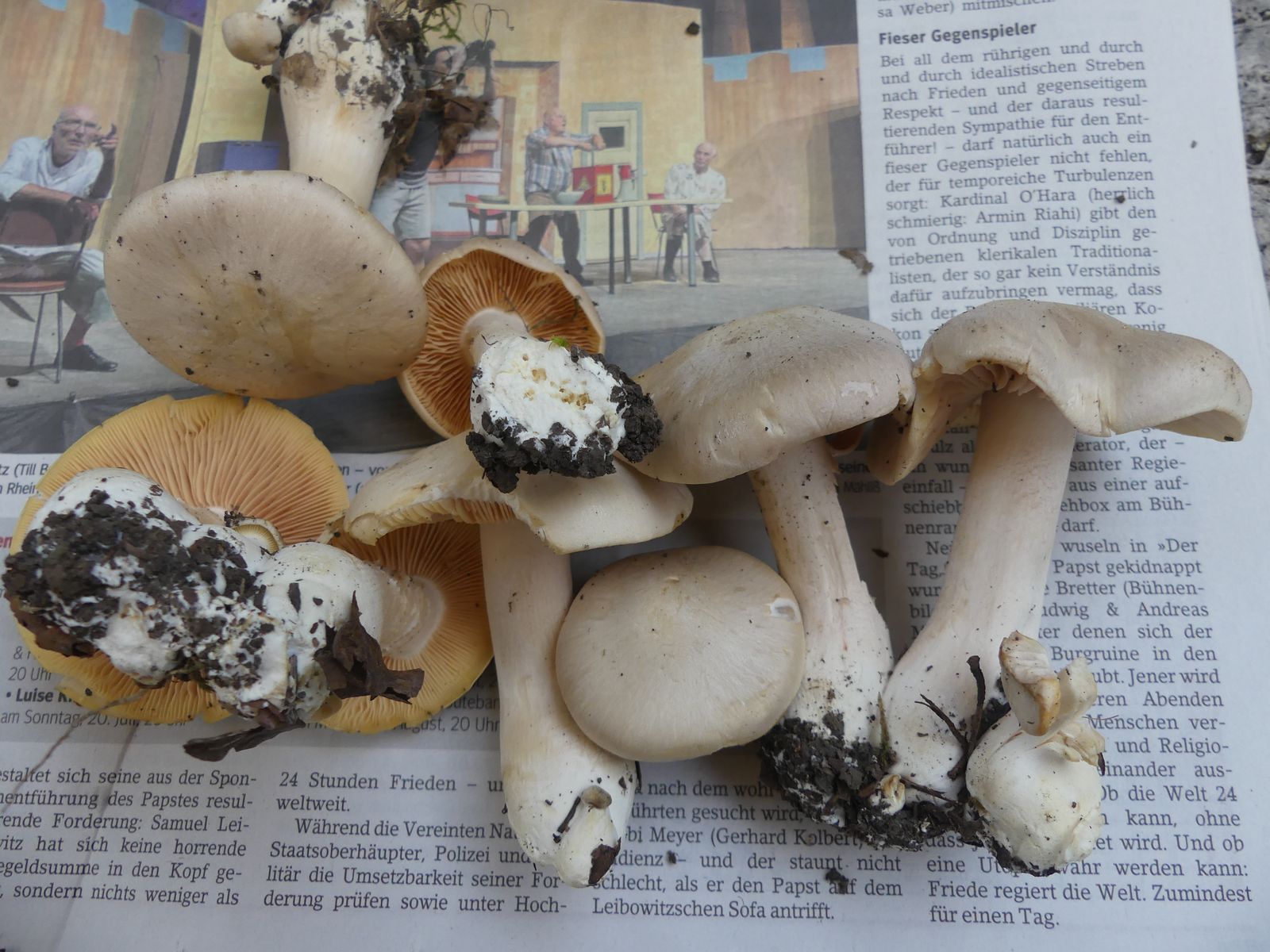 Einmal mehrere Exemplare vom Riesenrötling Entoloma sinuatum im thermophilen Eichen-Hainbuchen-Mischwald auf kalkhaltigem Boden in der Nähe von Würzburg unter einer Eiche. Dann - auf dem Rückweg/Heimfahrt - in der Nähe von der BAB Tankstelle Rohrbrunn an der A3 in schon fast Mittelgebirgslage vier Exemplare vom Hasenröhrling Gyroporus castaneus. Hier sind mir die Bodenverhältnisse unbekannt. Der wuchs auf einem aufgegebenen Rückeweg in Steilhanglage und war gut vor jeglichem Sonnenlicht abgeschirmt.