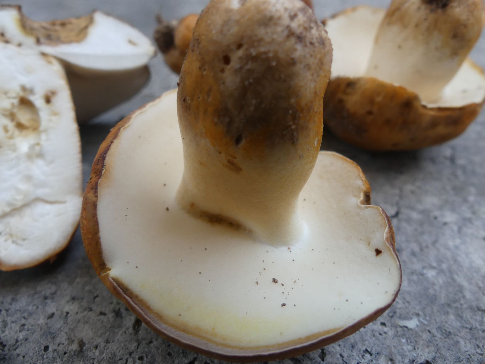 Ja, die Hutfarbe würde wohl passen. Aber dass die Röhrenmündungen sich überhaupt nicht blau verfärben wollen, irritiert mich etwas. An der Trockenheit/Feuchtigkeitsgehalt des Fruchtkörpers kann es nicht liegen, denn im Schnittbild hat der sich schön blau verfärbt.