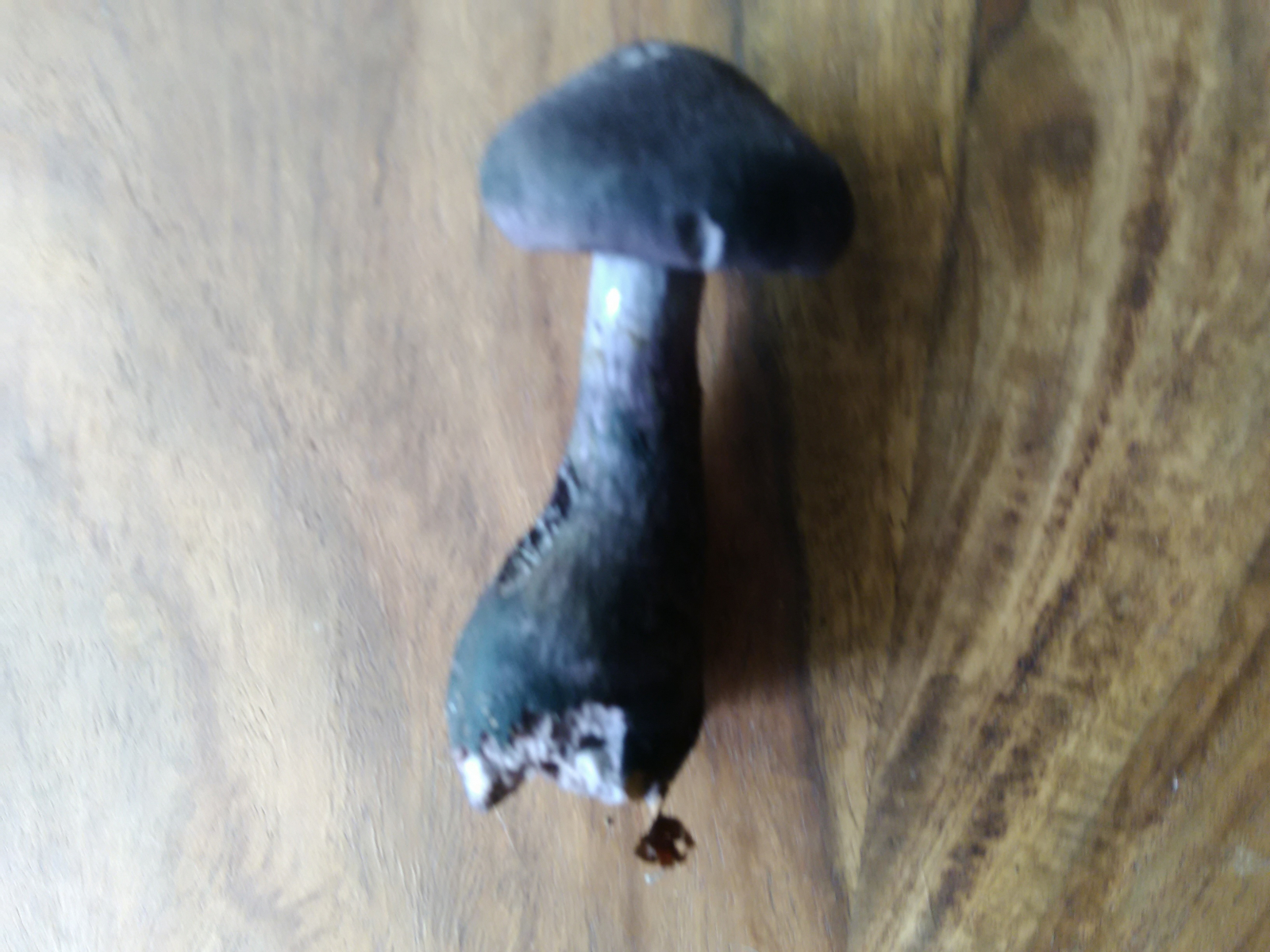 Hut und Stiel sind dunkel lila. Die Lamellen sind fast schwarz.