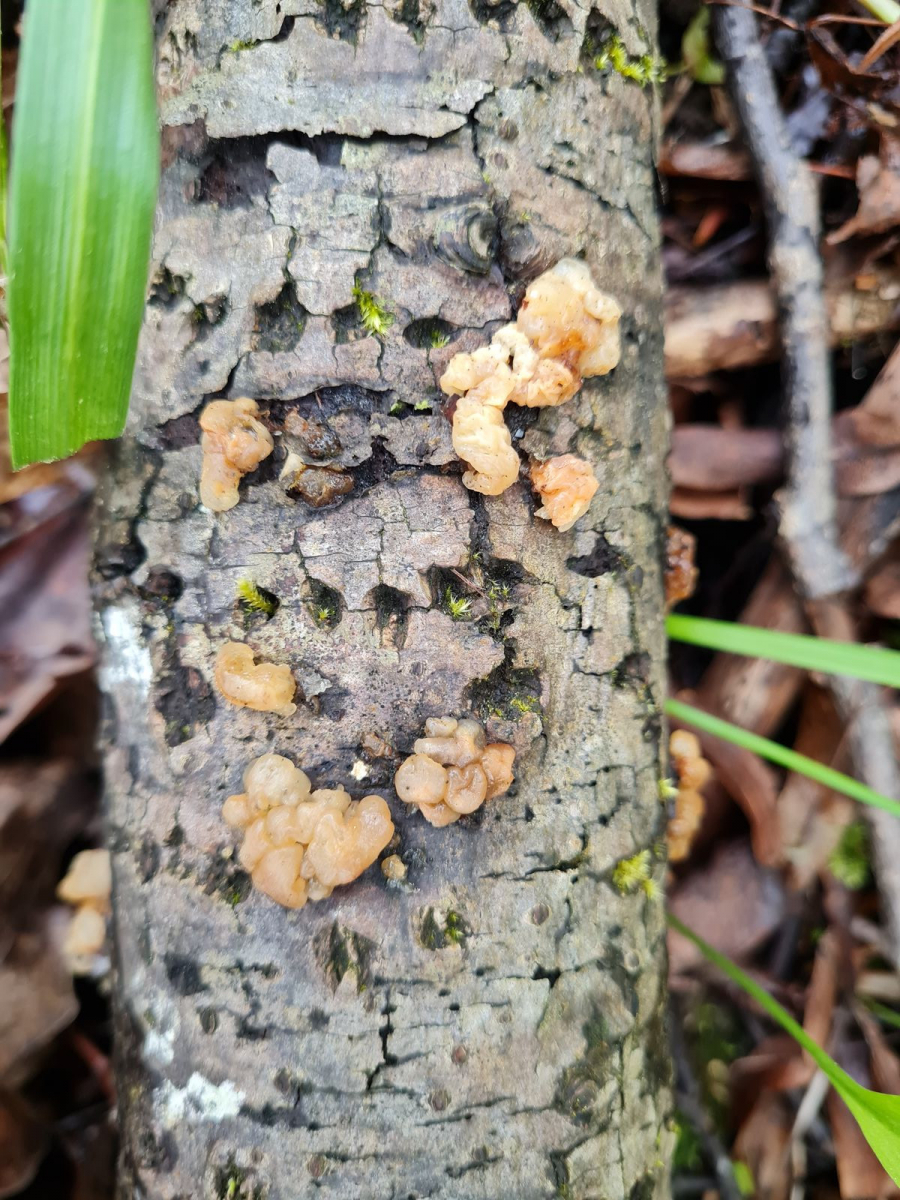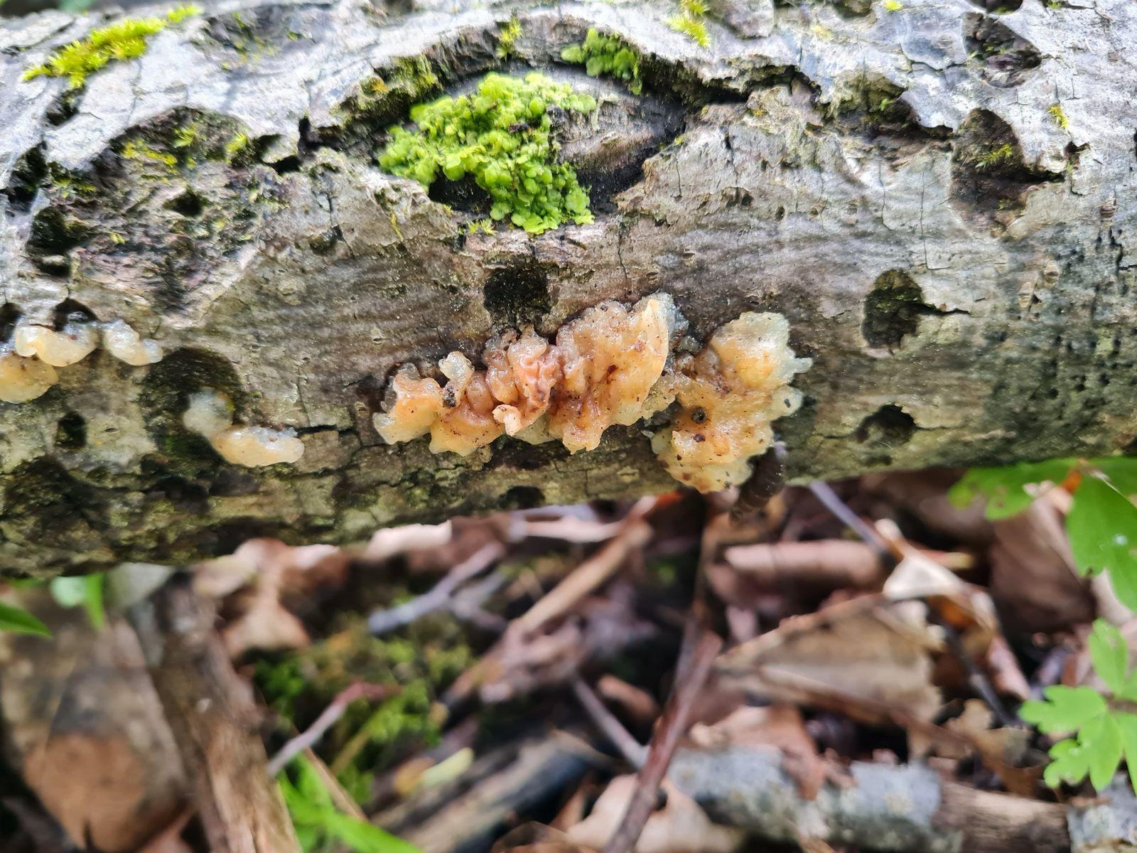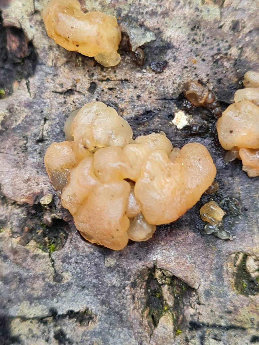 Ich dachte zuerst an einen Knorpeligen Drüsling (Exidia cartilaginea), der soll allerdings etwas bewimpert sein, was ich bei meinem Fund nicht feststellen konnte.