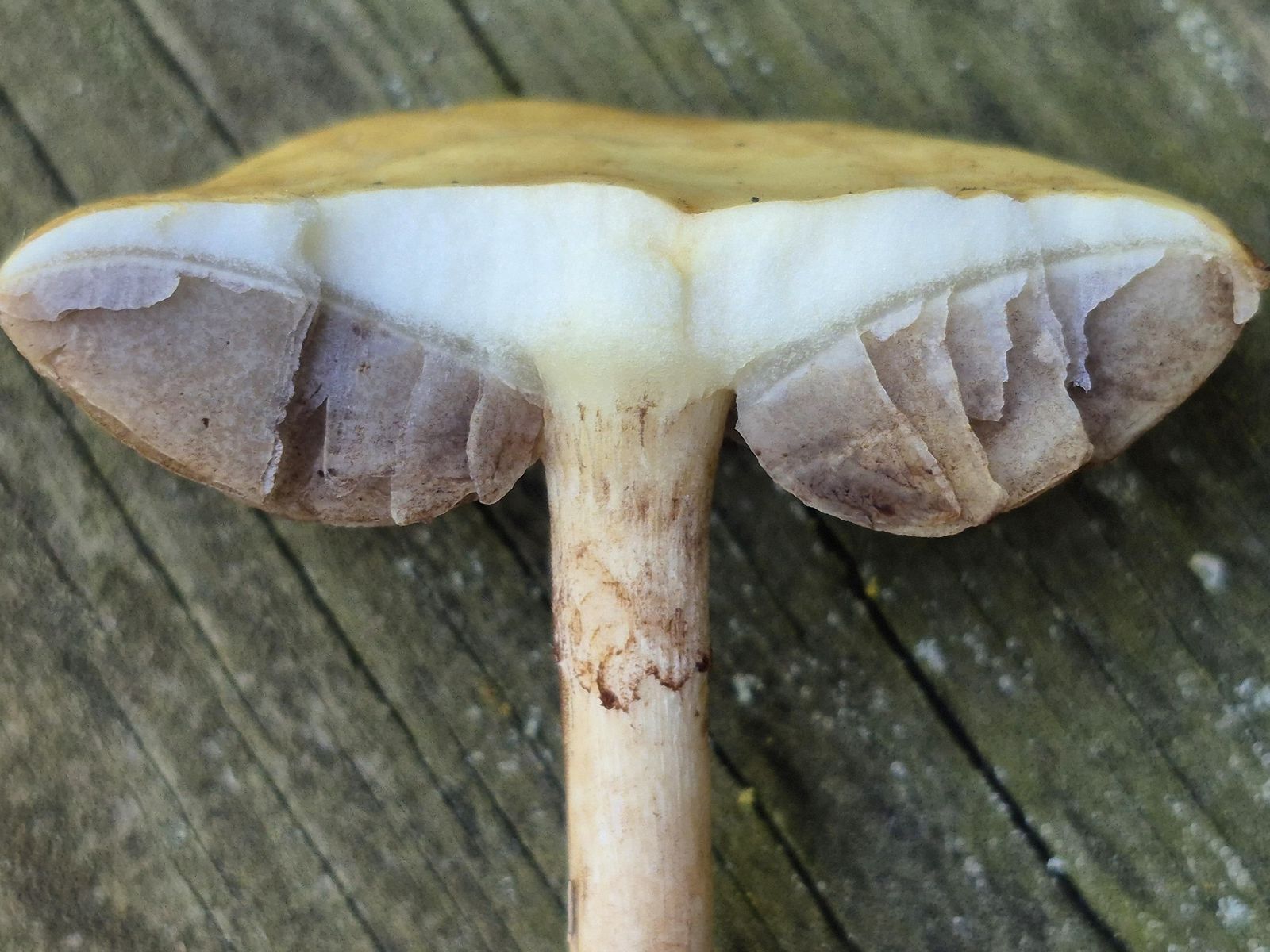 Im durchgeschnittenen Exemplar konnte ich unter der Stereolupe weiße Einschlüsse finden. Das brachte mich dann auf den Körnchen Drüsling (Myxarium nucleatum).