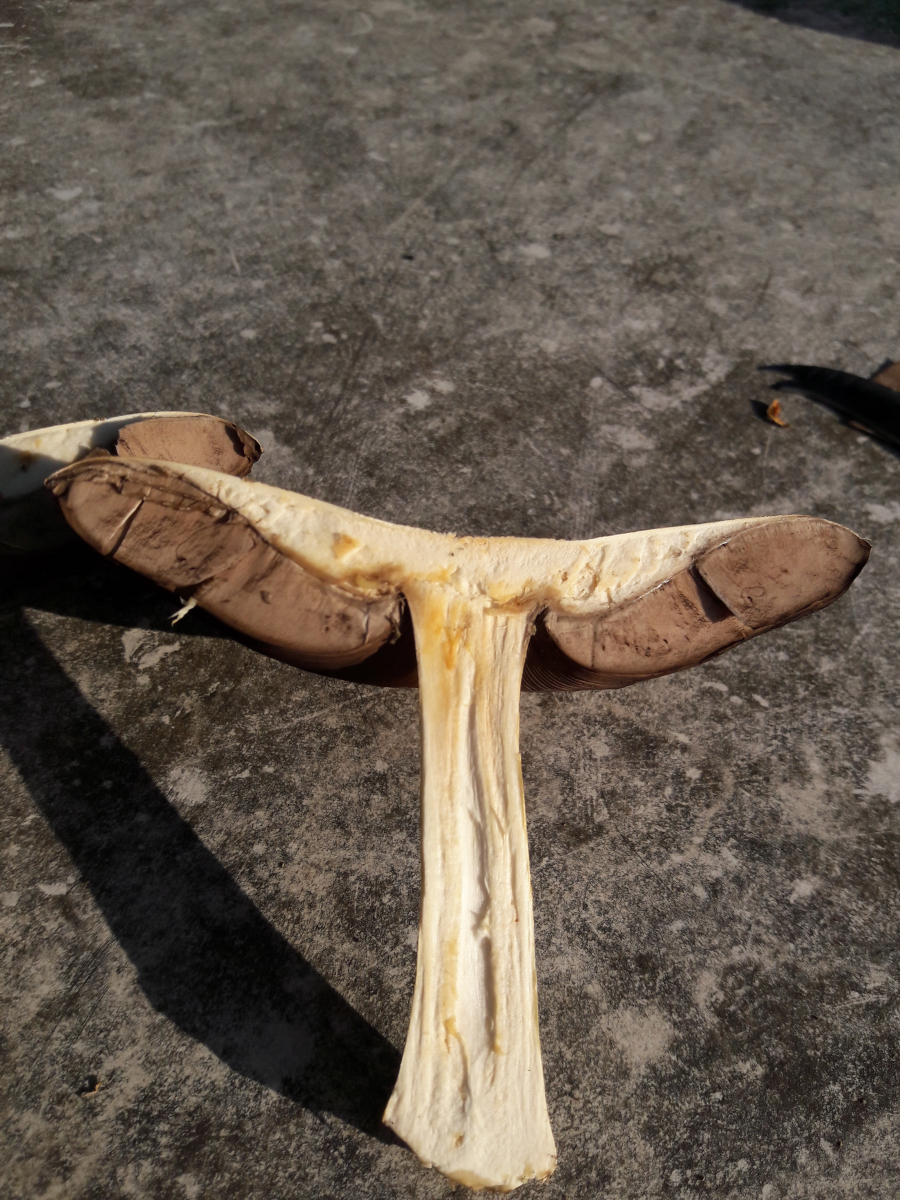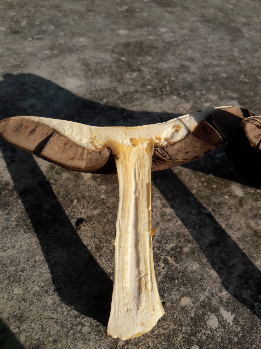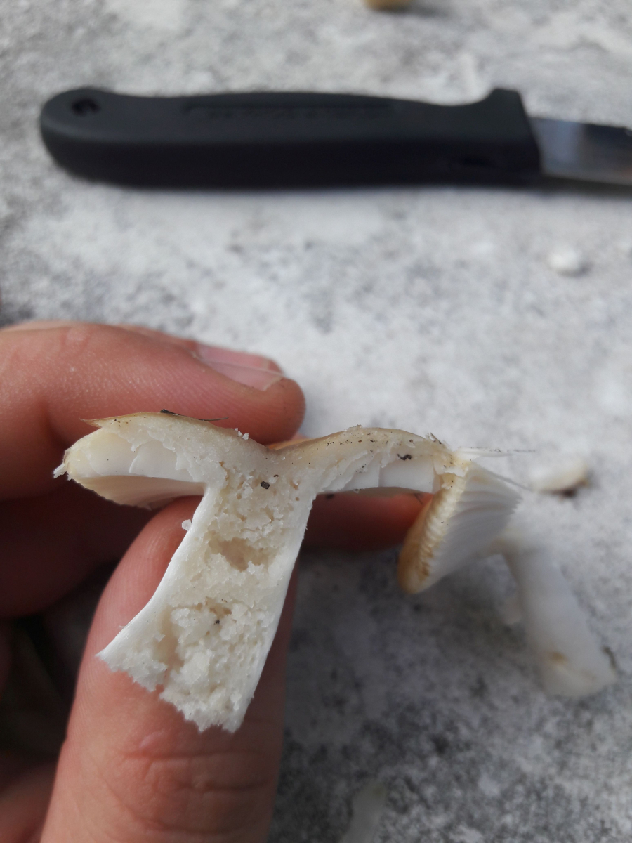 Stiel: Weiß, weich. Bei älteren Exemplaren fast hohl, hab das erst auf die Bewohner geschoben, aber auch bei jungen kleinen schon weich, wattig innen.