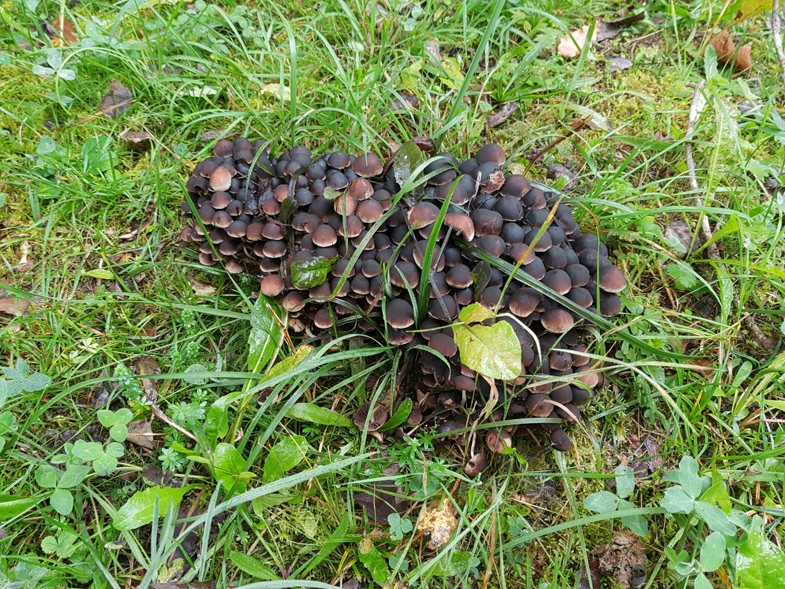 Heute auf dem Weg zur Arbeit habe ich folgenden Pilzhaufen gesehen. Er wächst direkt am Straßen- und Waldrand. Der Hut ist ca. 2cm bis 3cm im Durchmesser, die Sporen sind dunkelbraun bis schwarz. Auf dem Foto sieht man unter dem Haufen einen Pilz umgedreht, wo die Lamellen deutlich sichtbar sind. Heute ist es sehr nebelig, daher kann es sein, dass der Pilzhut sonst etwas heller ist.