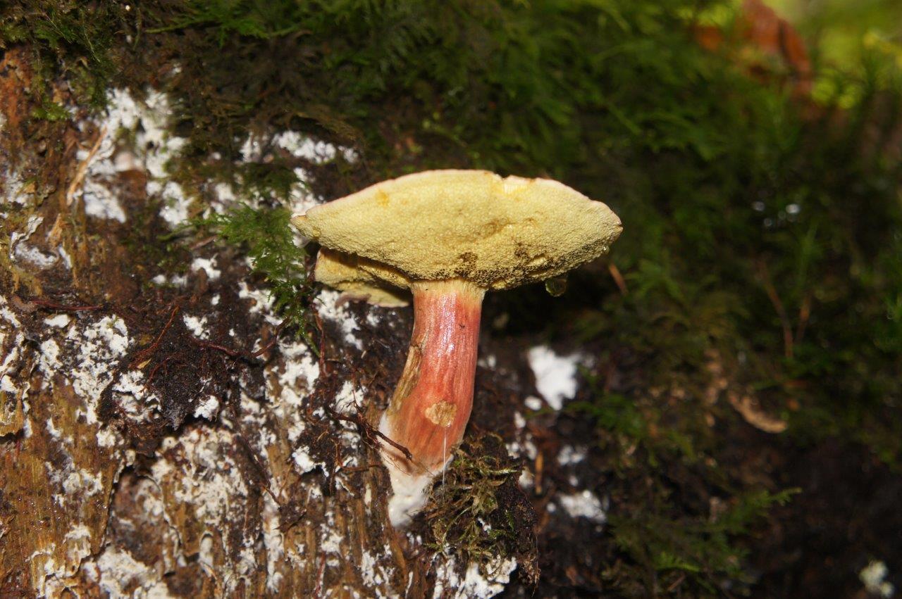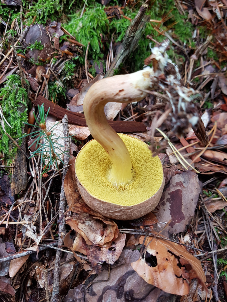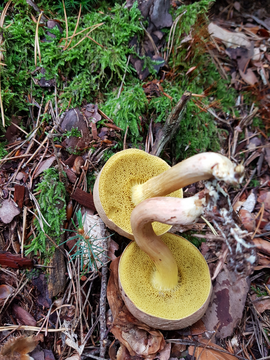 Direkt an meinem Arbeitsweg wachsen sehr viele dieser Pilze. Ich Ich habe versucht ihn anhand von Fotos im Internet zu identifizieren und tendiere zum Hexenröhrling. Die zwei jungen Pilze sind unten ganz rot (Sporen), der größere dagegen gelb.