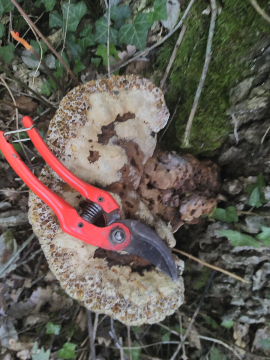 Der Pilz hat keine sehr harte Hutoberseite. Ich konnte relativ leicht ein Stück rausschneiden.