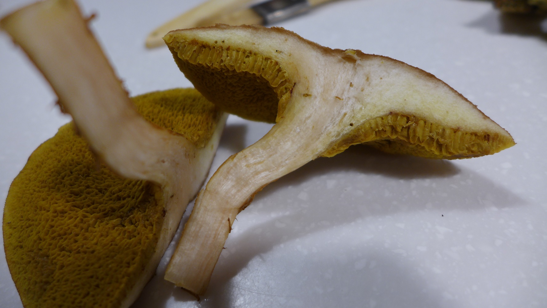 Die Lamellen sind quitschgelb, auch ein auf und ab. Beim großen Exemplar sind sie langgezogen mit dem Stil verbunden, bei den kleineren ist eine Ausbuchtung vorhanden, ähnlich wie bei den Maronen.