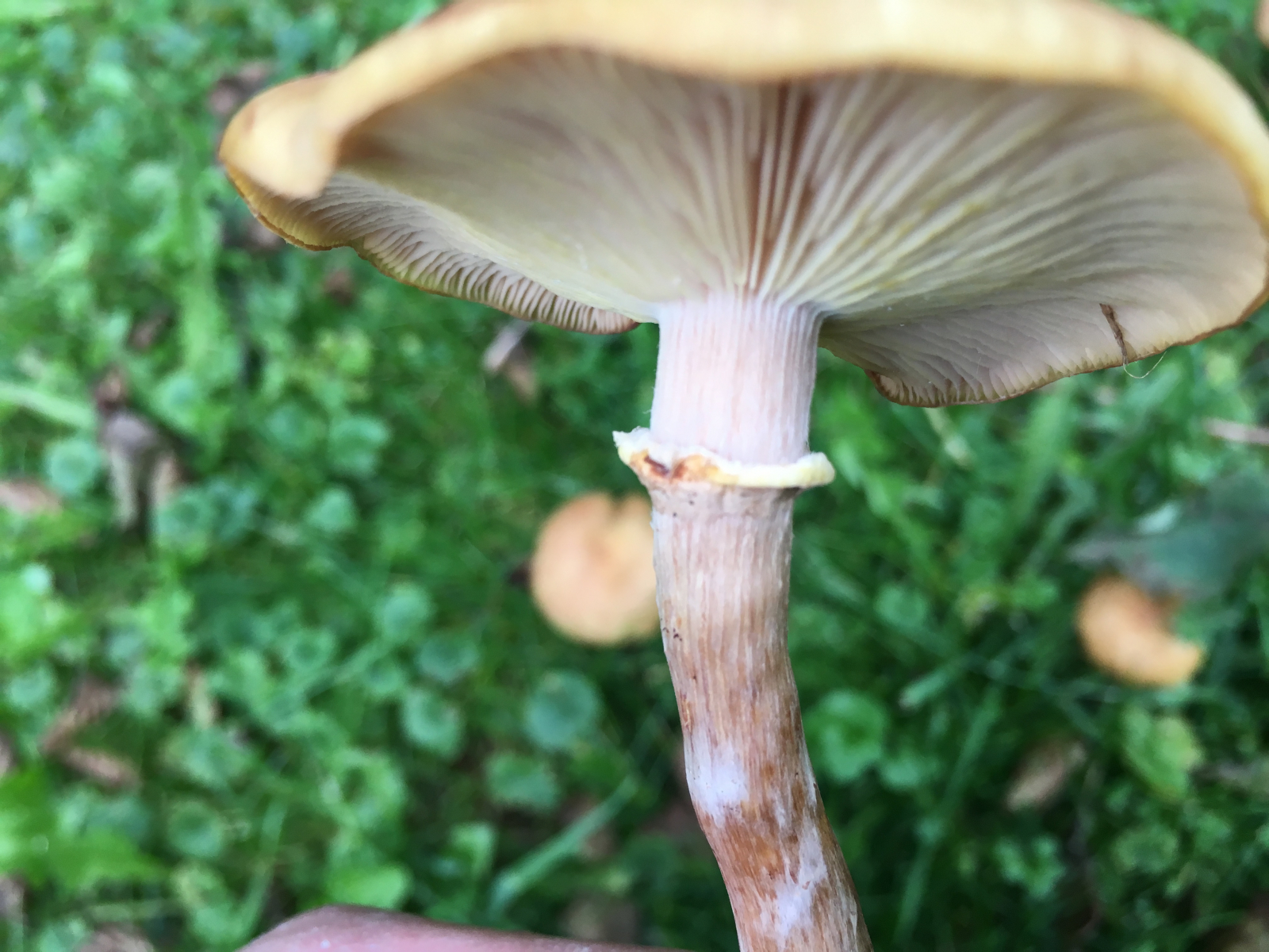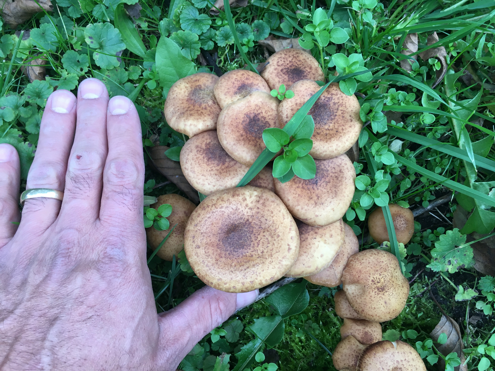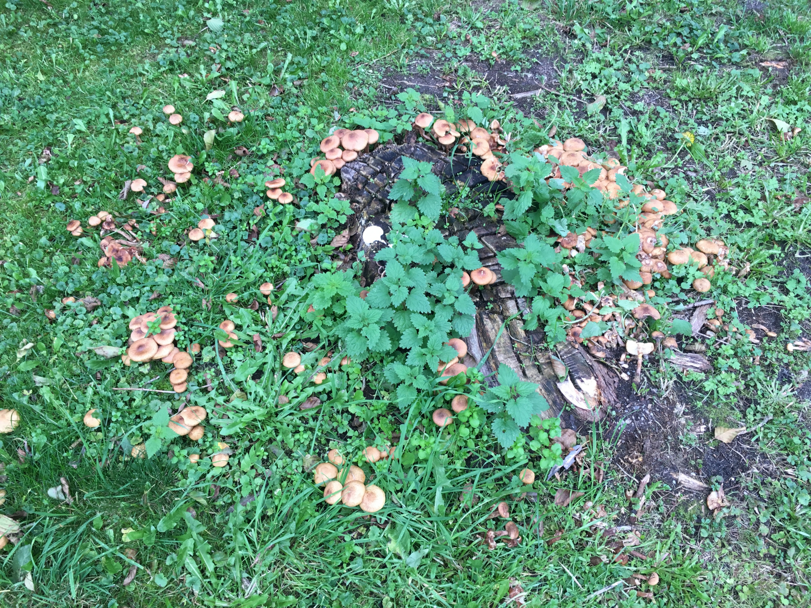 Am Samstag beim Rasenmähen habe ich am Fluss im Gras ca. hundert dieser Pilze gefunden. Sie wachsen aus einer bodengleich abgeschnittenen Weide. Ein paar Meter weiter ist eine Stumpf einer Esche, aus dieser wachsen die Pilze auch. Standort ist halbschatten, eher feucht, in einer Wiese.