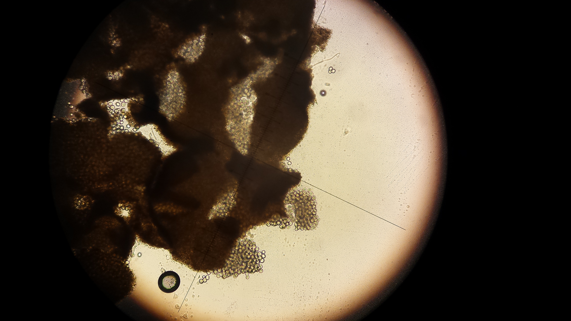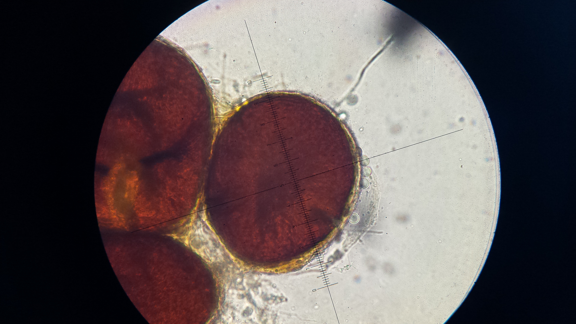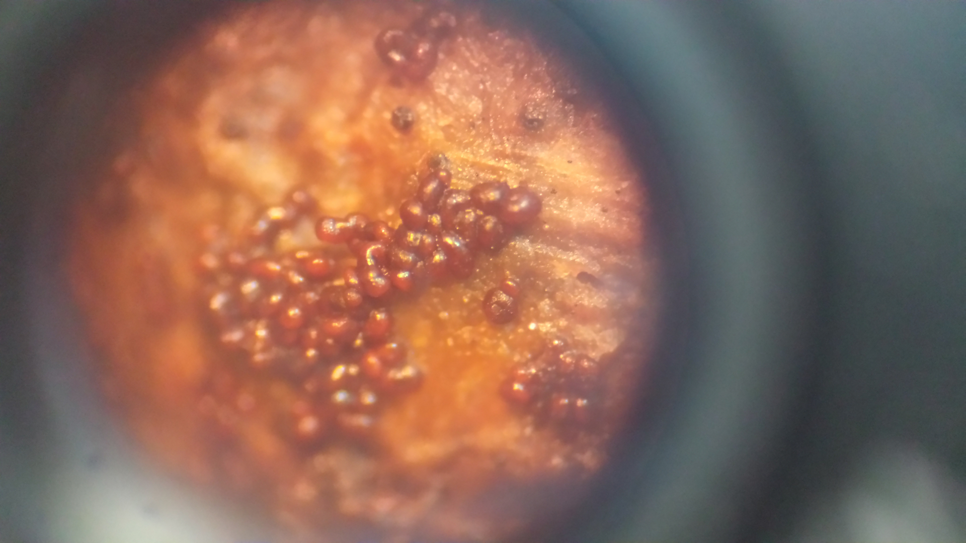 Auf meinem Wildkaninchen wachsen wunderliche Dinge. Was könnten diese Kügelchen sein? Scheinen mit ca. 5 µm großen kugelförmigen Sporen gefüllt zu sein. Ich hab keine Idee.