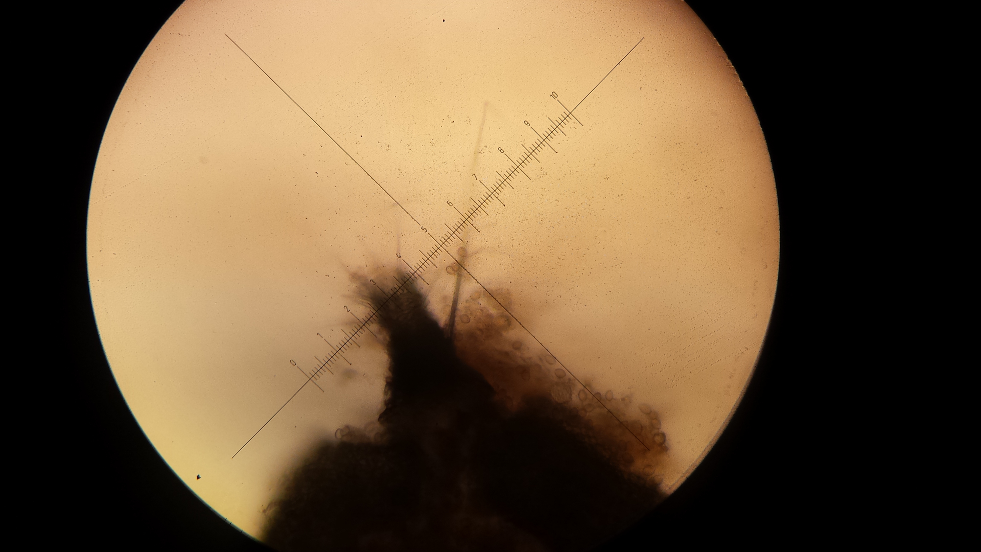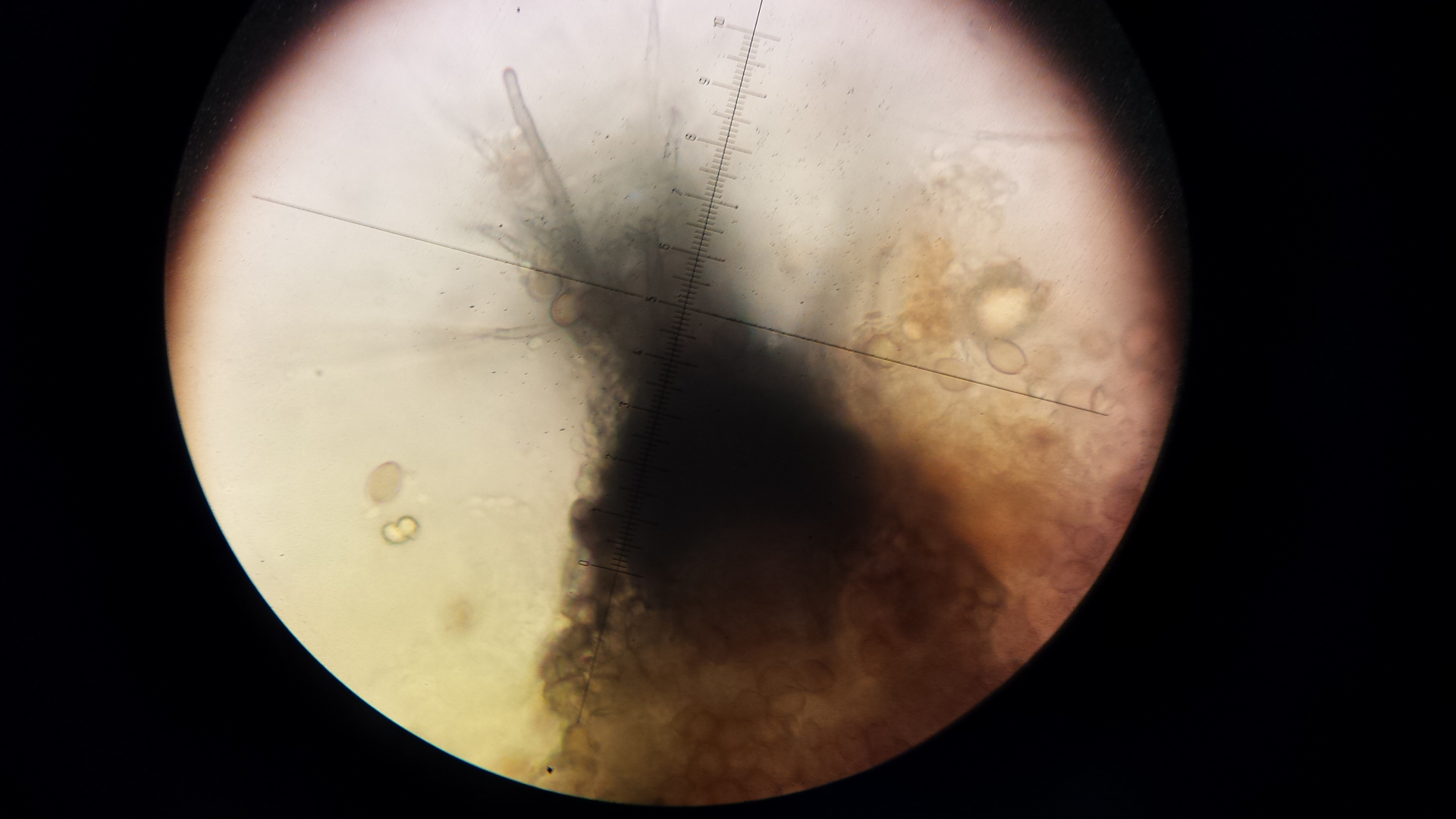 makroskopisch war ein Büschel heller gerade Haare zu sehen, aus dem Substrat kam dann ein schwarzer, Fruchtkörper zum Vorschein. Die Form und Farbe der Sporen und die offebar sehr leicht vergänglichen Asci (hab aber noch unreife, clavate Asci mit 8 Sporen gefunden), leiten mich in Richtung Chaetomium, wobei der eingesenkte FK und die vergleichsweise wenige Behaarung nicht so recht passen. Sporen sind 8µm lang und in der Mitte 6µµ breit. Hat jemand einen Hinweis?