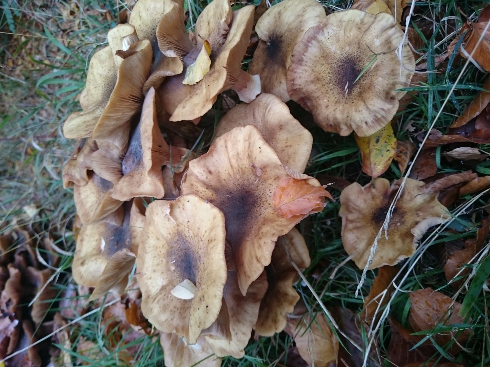 Könnten das Hallimasch sein? So richtig viel Schuppen haben die Hüte ja nicht. Auf Totholz sind die glaube ich nicht gewachsen, zumindest war das nicht zu sehen.