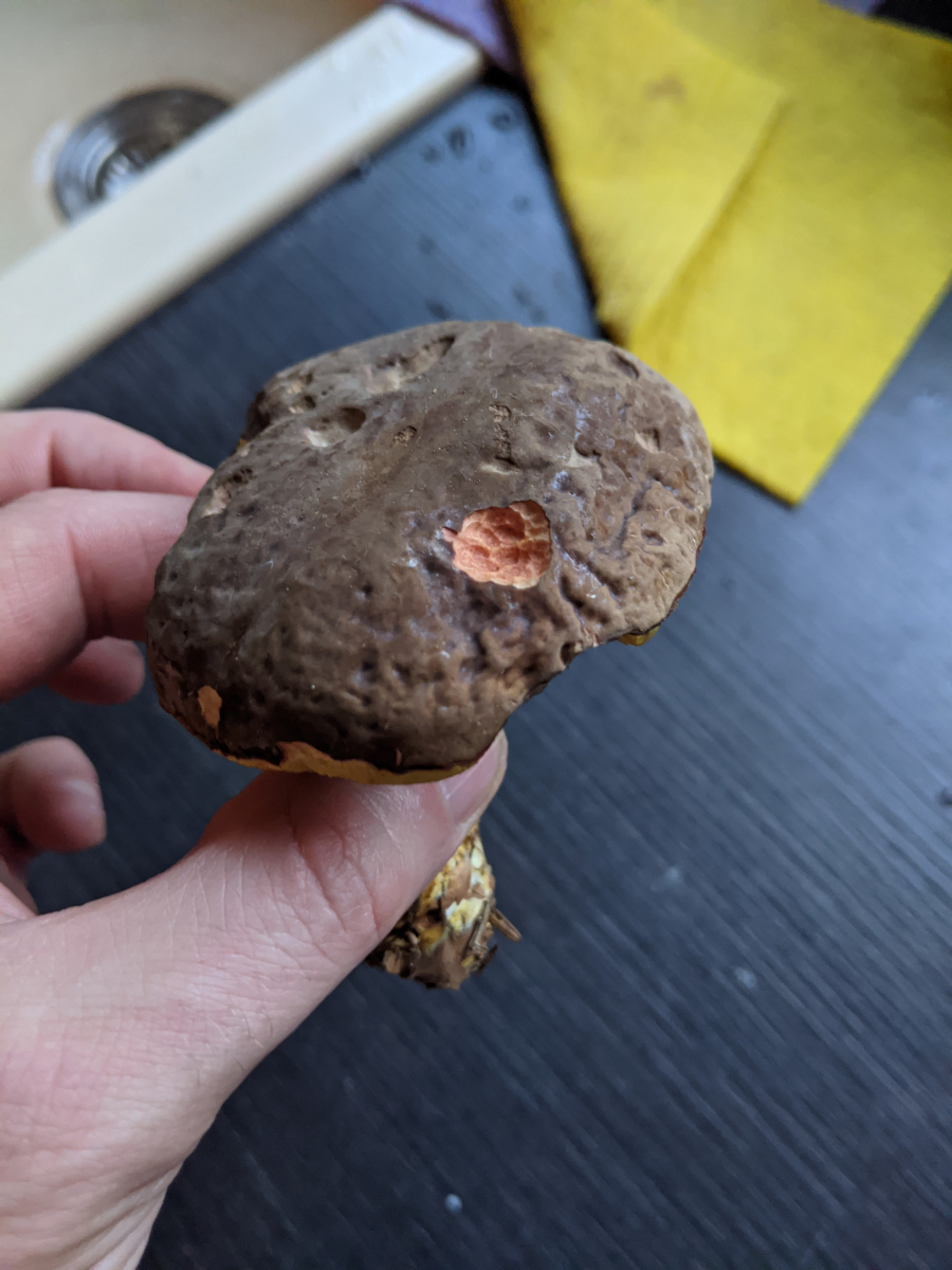 Der Stiel ist auffällig grob geschuppt und die Schuppen sind sehr dunkel. Der Hut sieht aus wie ein dunkler Fichtensteinpilz, dunkelbraun, das kommt auf den Kunstlicht Fotos nicht gut rüber.