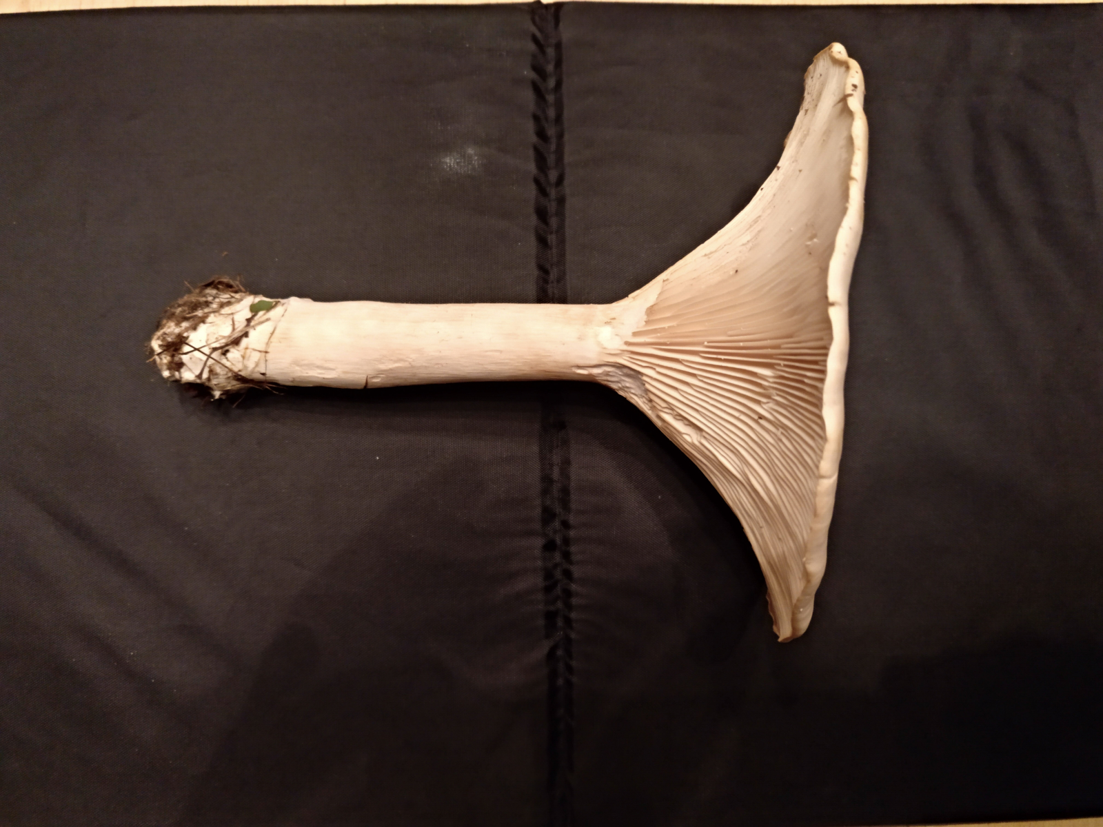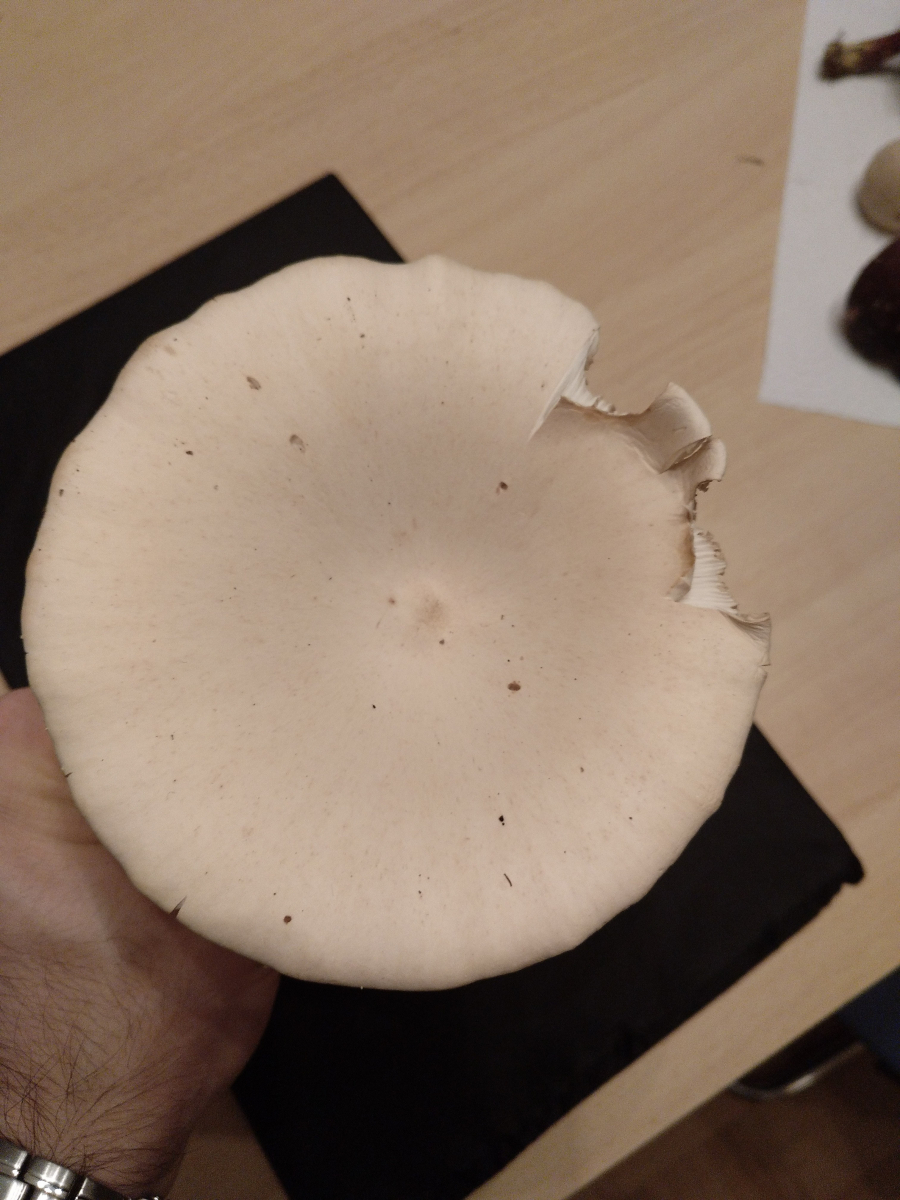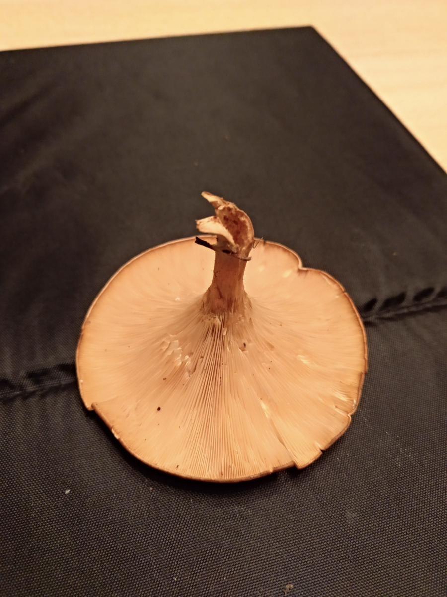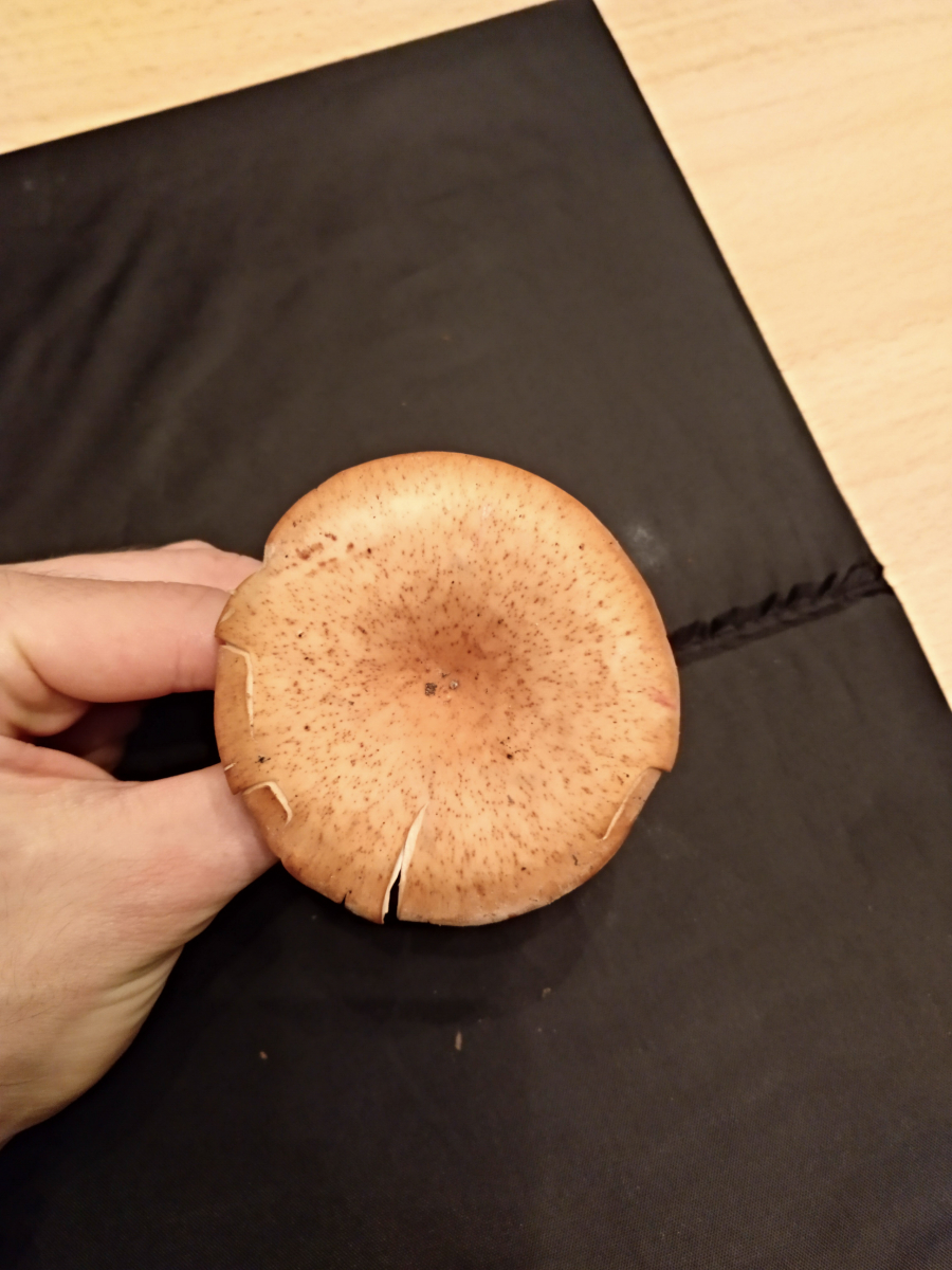 Die erste Vermutung fiel auf einen Wasserfleckiger Röteltrichterling, bei genauerer Betrachung waren das jedoch keine Flecken auf dem Hut sondern kleine schwarze Pünktchen. Daher vielleicht auch ein Fuchsiger Röteltrichterling. Jedoch habe ich keine Bilder gefunden die mich bei der eindeutigen Zuordnung zufrieden stellen würden.