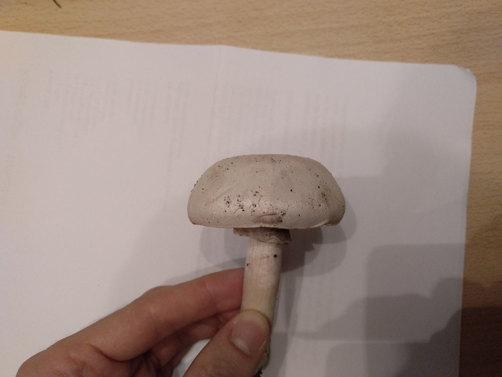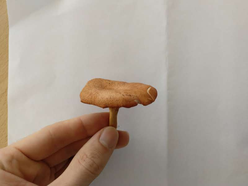 Der Hut hat ca. 6cm Durchmesser, der Stiel ist 3cm lang und 0,5cm dick. DIe Lamellen sind etwas brüchig, jedoch ist es auch kein ganz frisches Exemplar mehr. Der Geruch ist sehr angenehm, erinnert an frische Champignons.