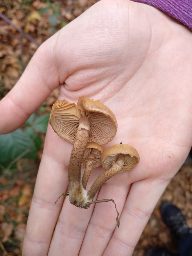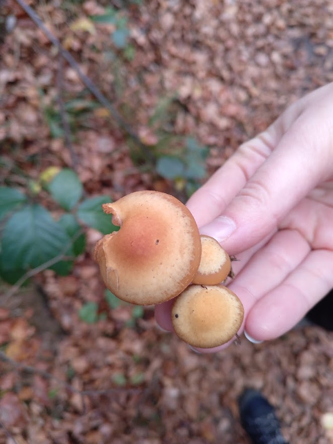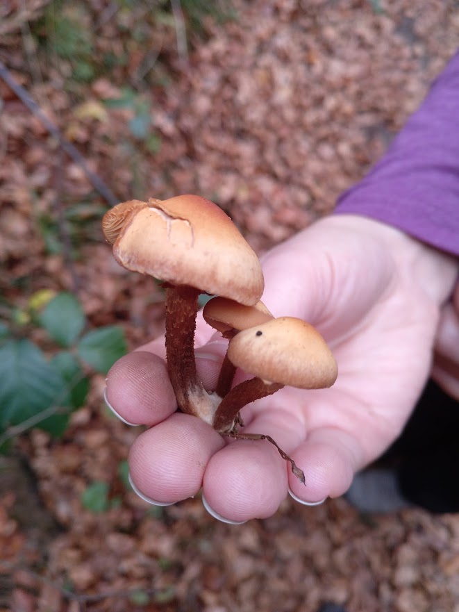 Der linke ist so ein Exemplar. Zuerst hielt ich ihn beim vorbeilaufen für ein altes Stockschwämmchen, aufgrund der Massen (im Radius von ~6m war alles voll) war Hallimasch (auch noch nie gesammelt/bestimmt) dann aber wahrscheinlicher. Dabei ist mir aufgefallen, das ein alter Gifthäubling und ein alter Hallimasch ggf sehr große Ähnlichkeiten haben könnten.