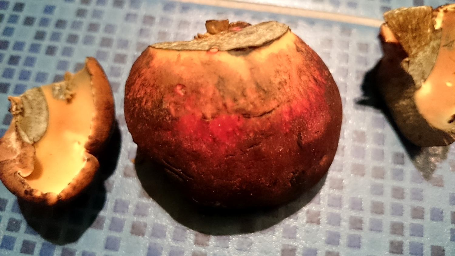 So ohne Flockung und Netz, der fast Purpur farbene Stiel.