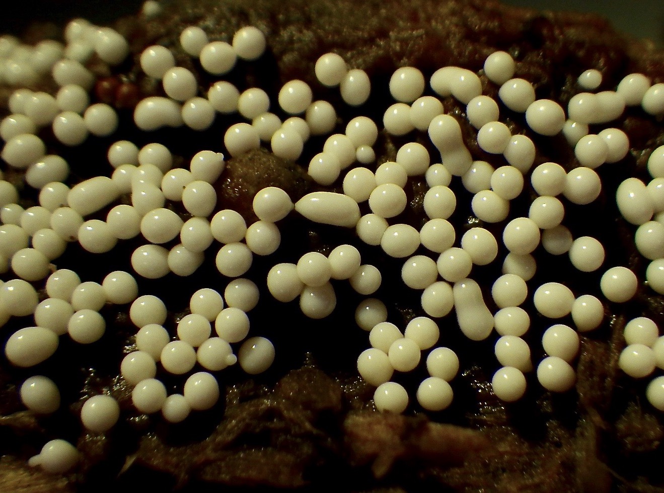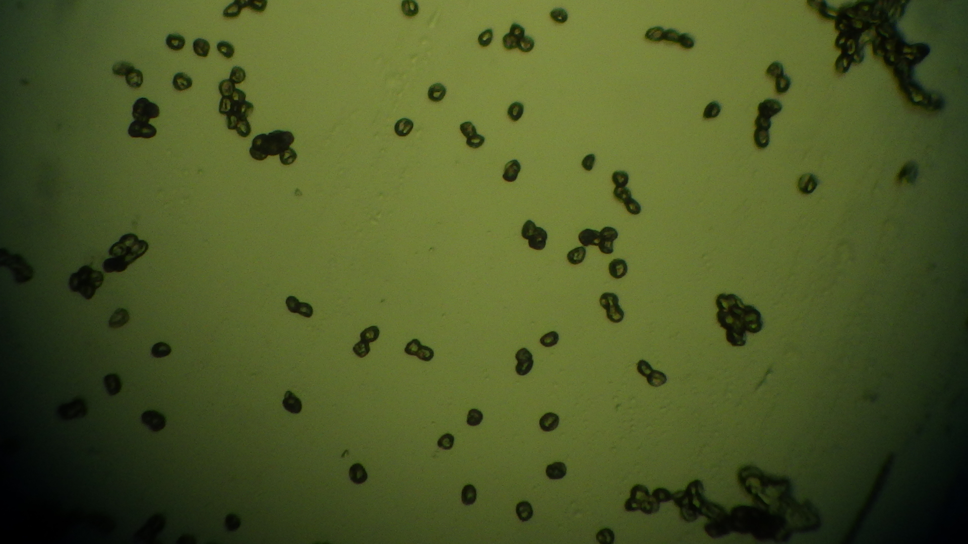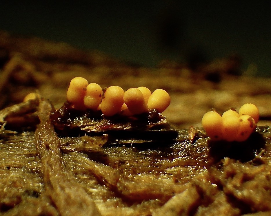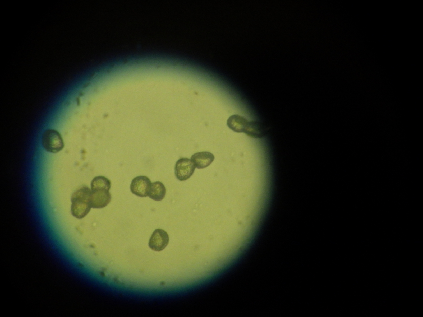 Die zuerst weissen Pilzkügelchen sind nur knapp 1mm gross, sind weich und wenn man auf sie drückt kommt nur eine weissliche Flüssigkeit raus, Sporen habe ich bei diesen nicht wirklich gefunden. Die nach einemTag gelben Pilzchen sind etwas härter, sie lassen sich nicht mehr einfach zerdrücken und unter dem Mikroskop lassen sich aber viele Sporen erkennen. Die Sporen sind rundlich, Kartoffel-ähnlich plump. Auf den unteren Fotos könnt ihr dies erkennen.