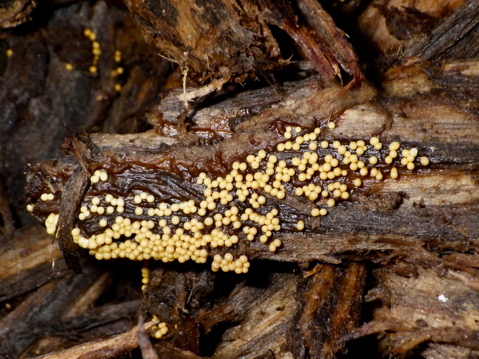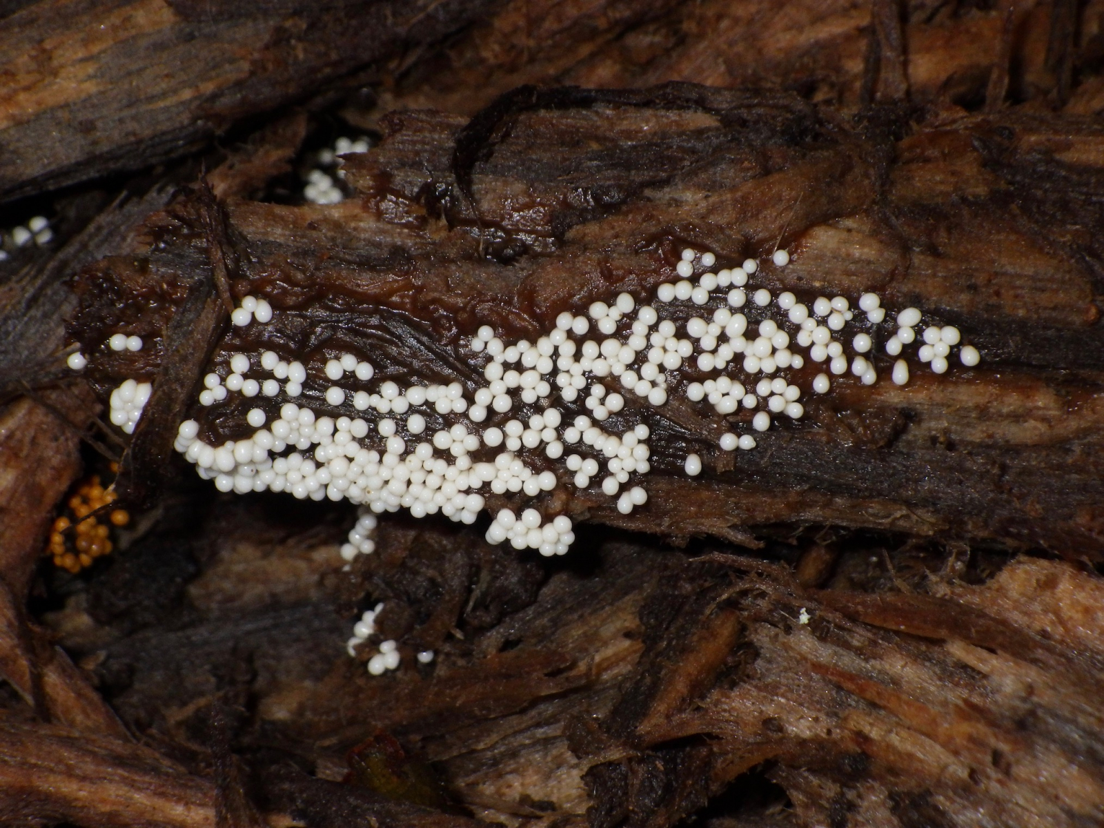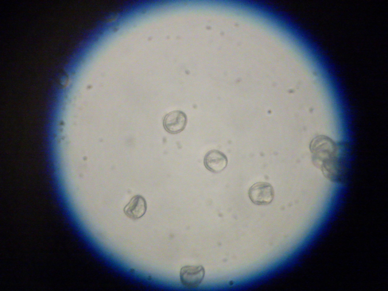 Die zuerst weissen Pilzkügelchen sind nur knapp 1mm gross, sind weich und wenn man auf sie drückt kommt nur eine weissliche Flüssigkeit raus, Sporen habe ich bei diesen nicht wirklich gefunden. Die nach einemTag gelben Pilzchen sind etwas härter, sie lassen sich nicht mehr einfach zerdrücken und unter dem Mikroskop lassen sich aber viele Sporen erkennen. Die Sporen sind rundlich, Kartoffel-ähnlich plump. Auf den unteren Fotos könnt ihr dies erkennen.