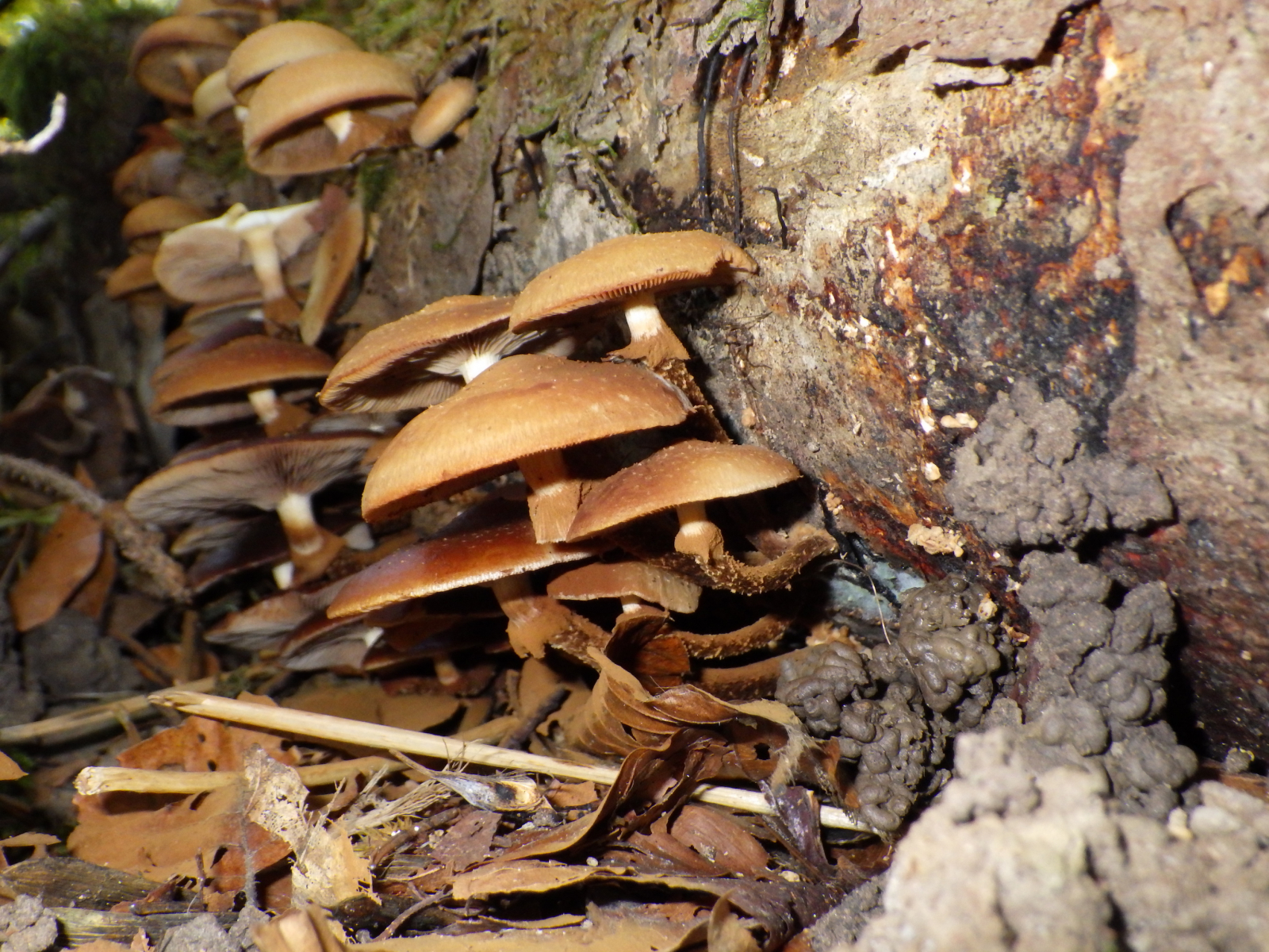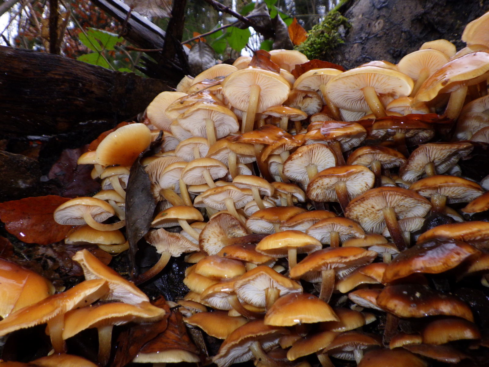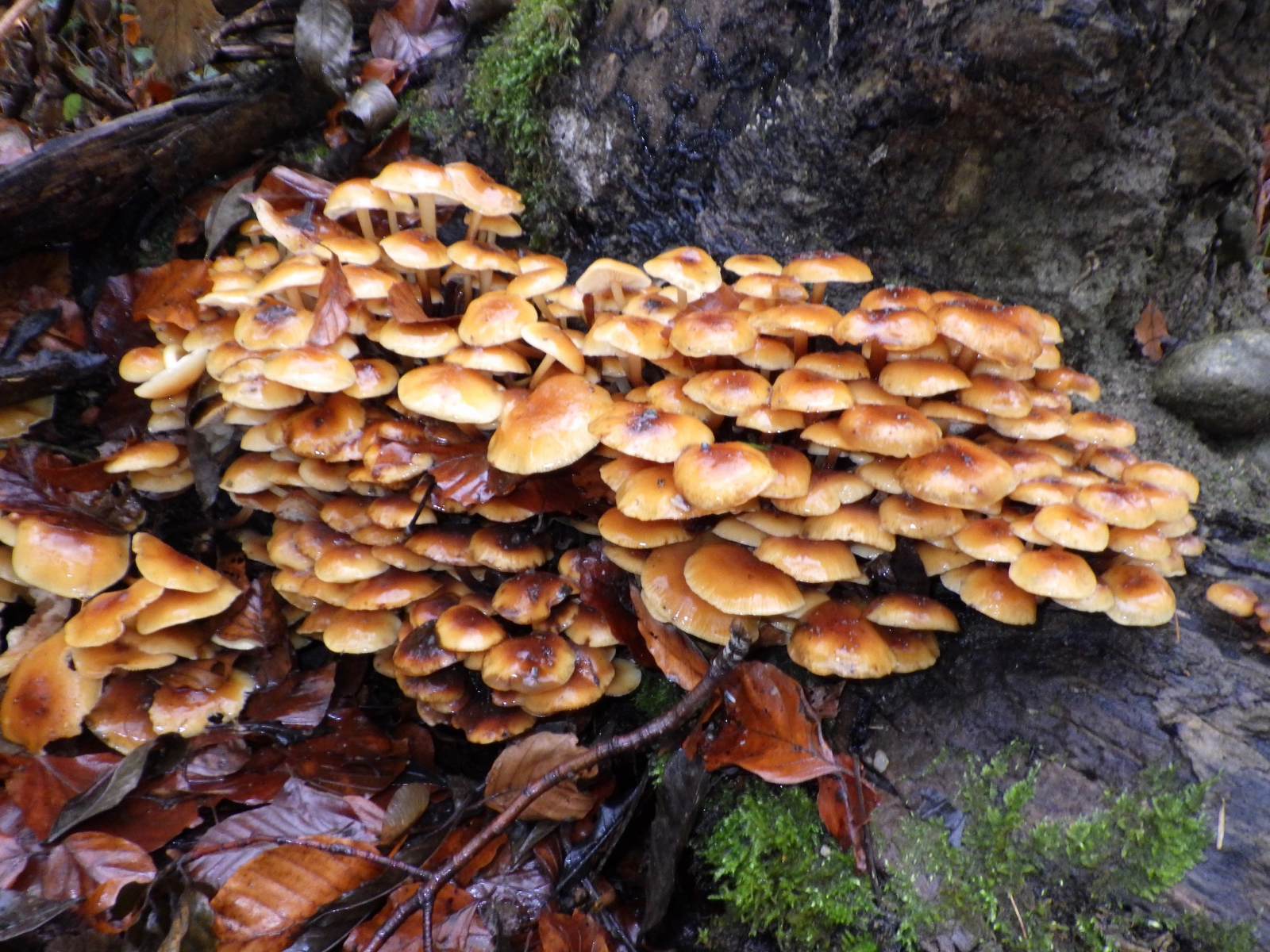 3) Eine Gruppe Totholzpilze mit gelben klebrigen Hüten mit braunen Velumresten, neutraler Geruch, die Stiele waren sehr gummig, man konnte sie durchbiegen, schuppig