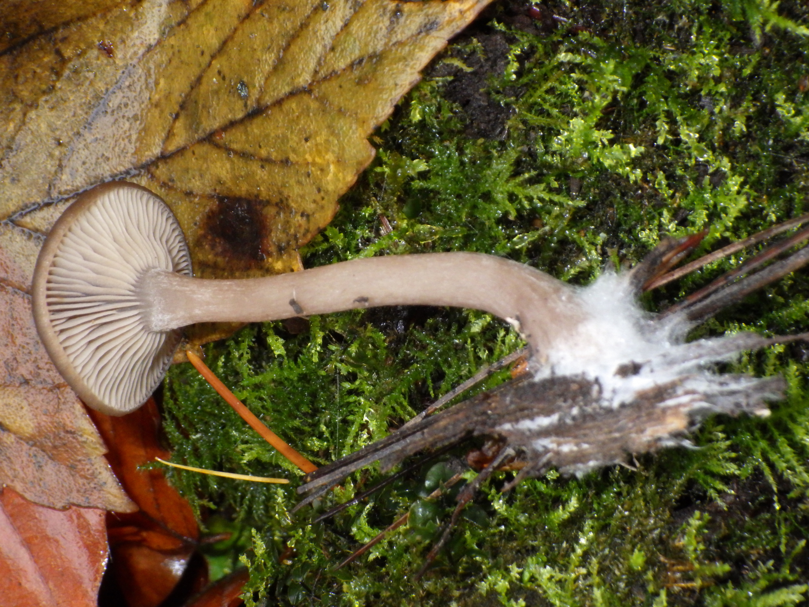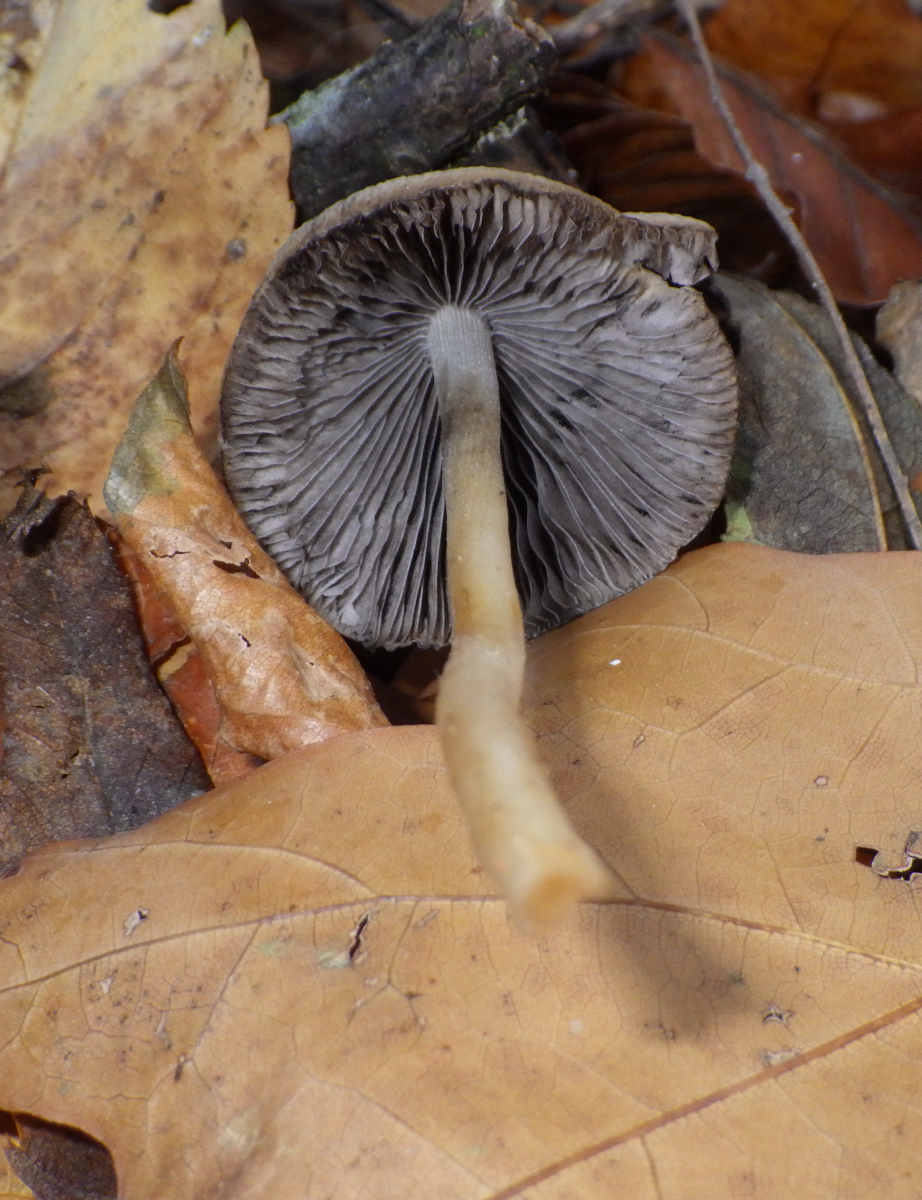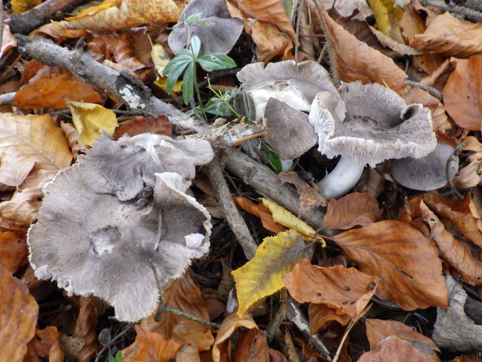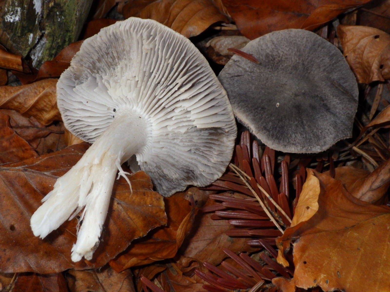 1) Mausgrauer Ritterling? Alte und jüngere Pilze im Mischwald, faserige Stiele