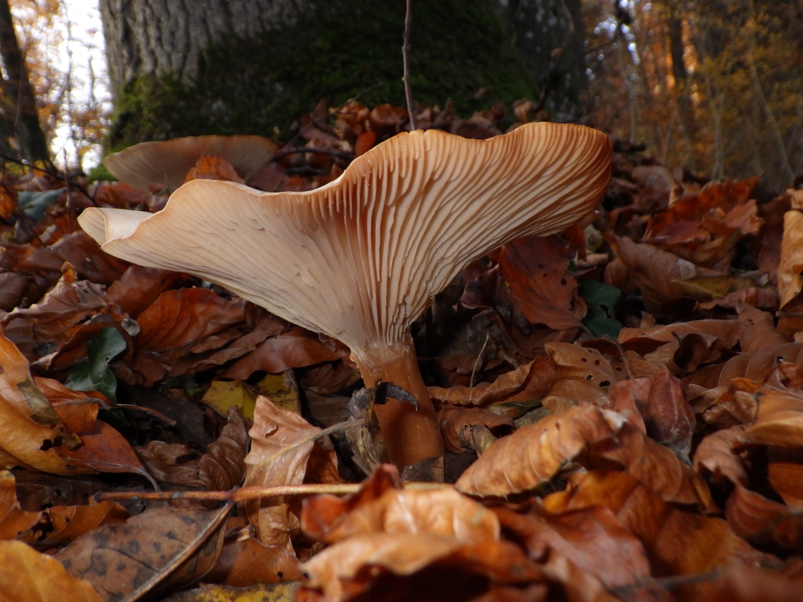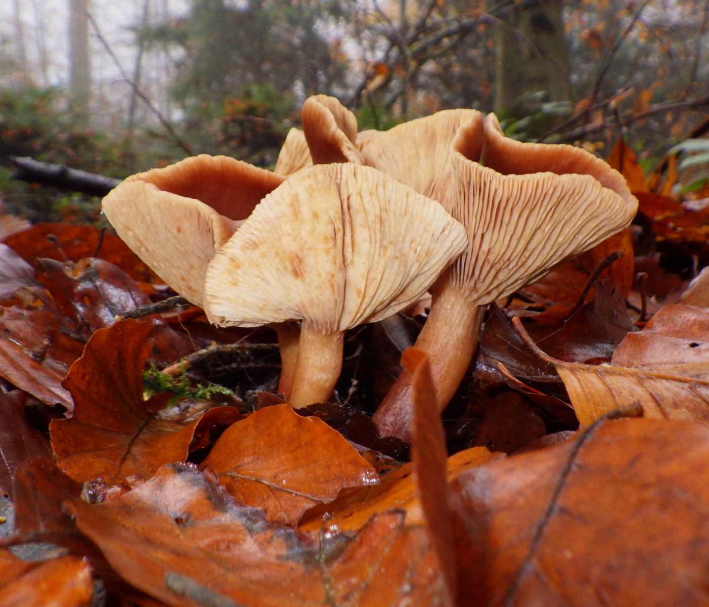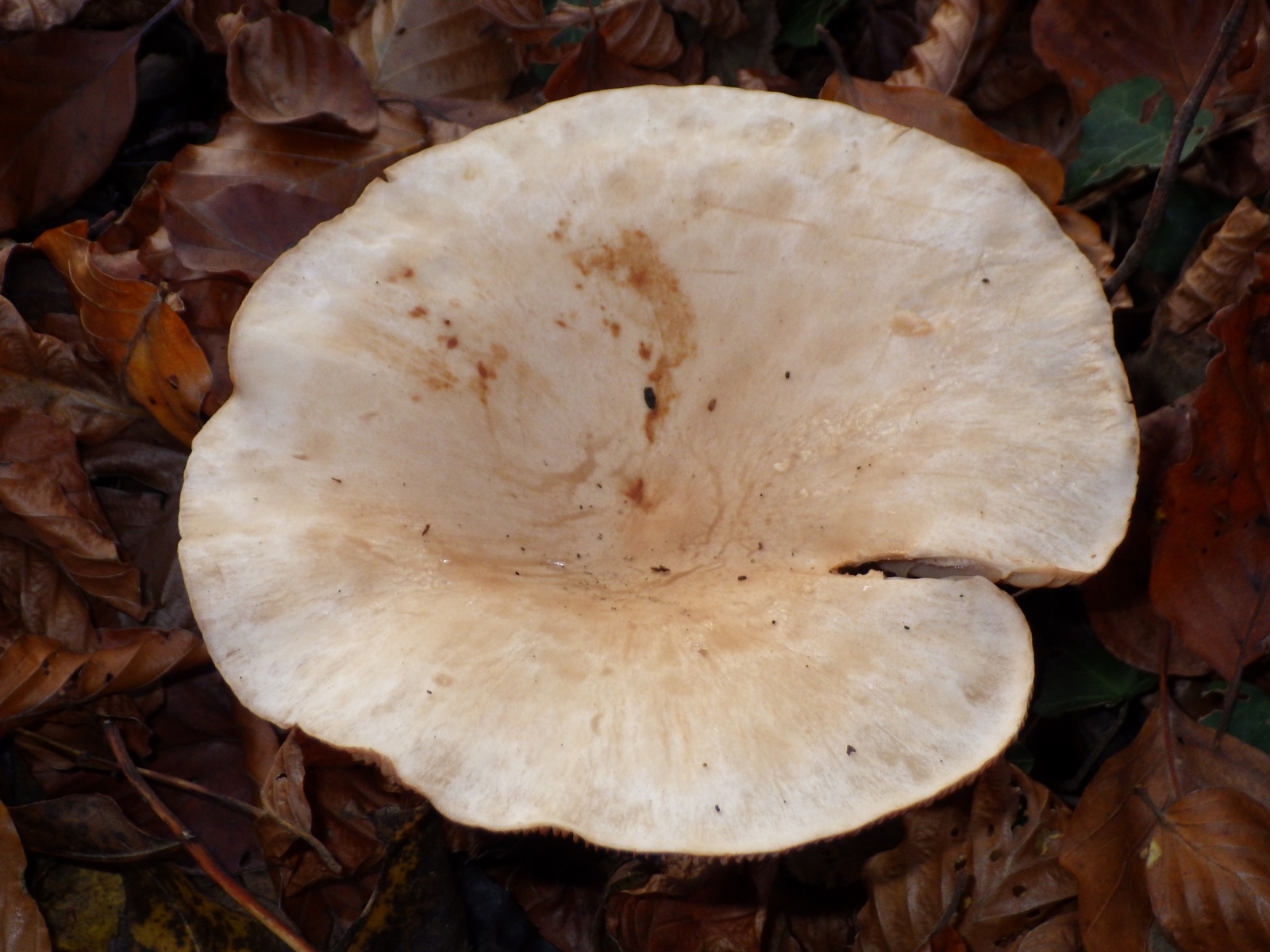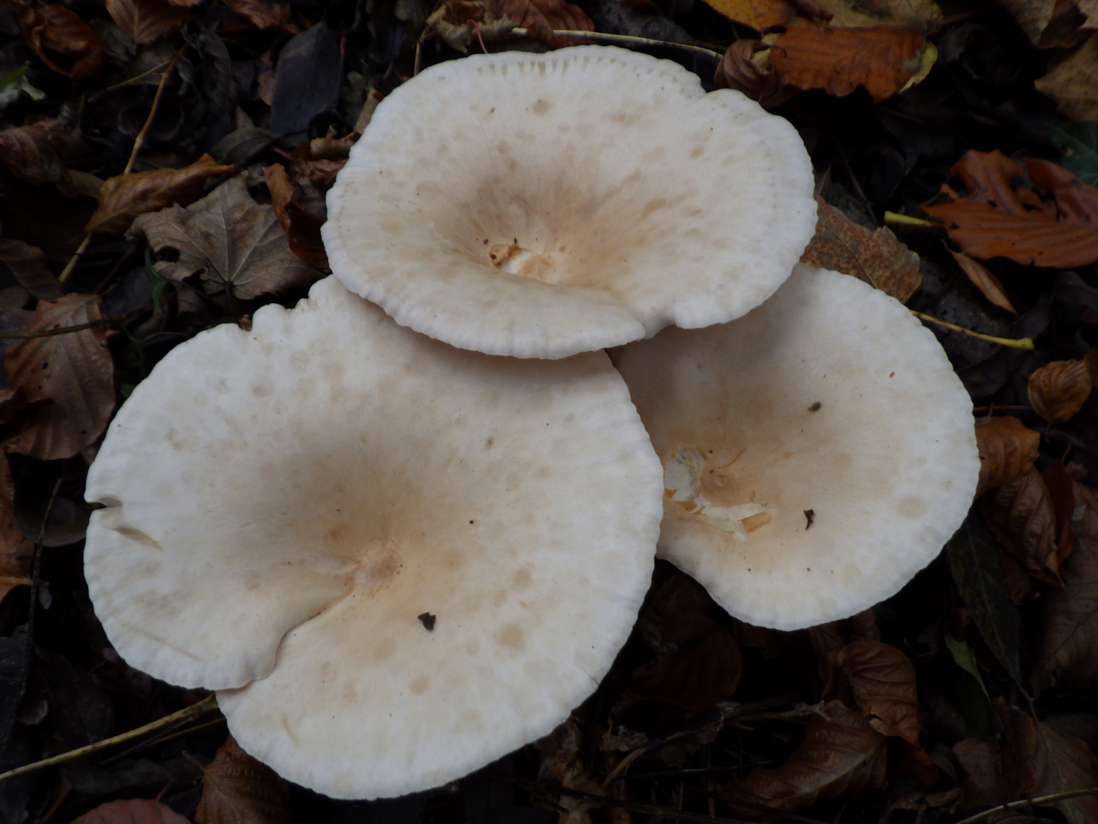 2) Trichterlinge: Hellbraune Hüte bis 17cm ø um Buchen teils grosse Hexenringe bildend, eventuell Bleiweisser Trichterling? Hut und Lamellen ohne Milch