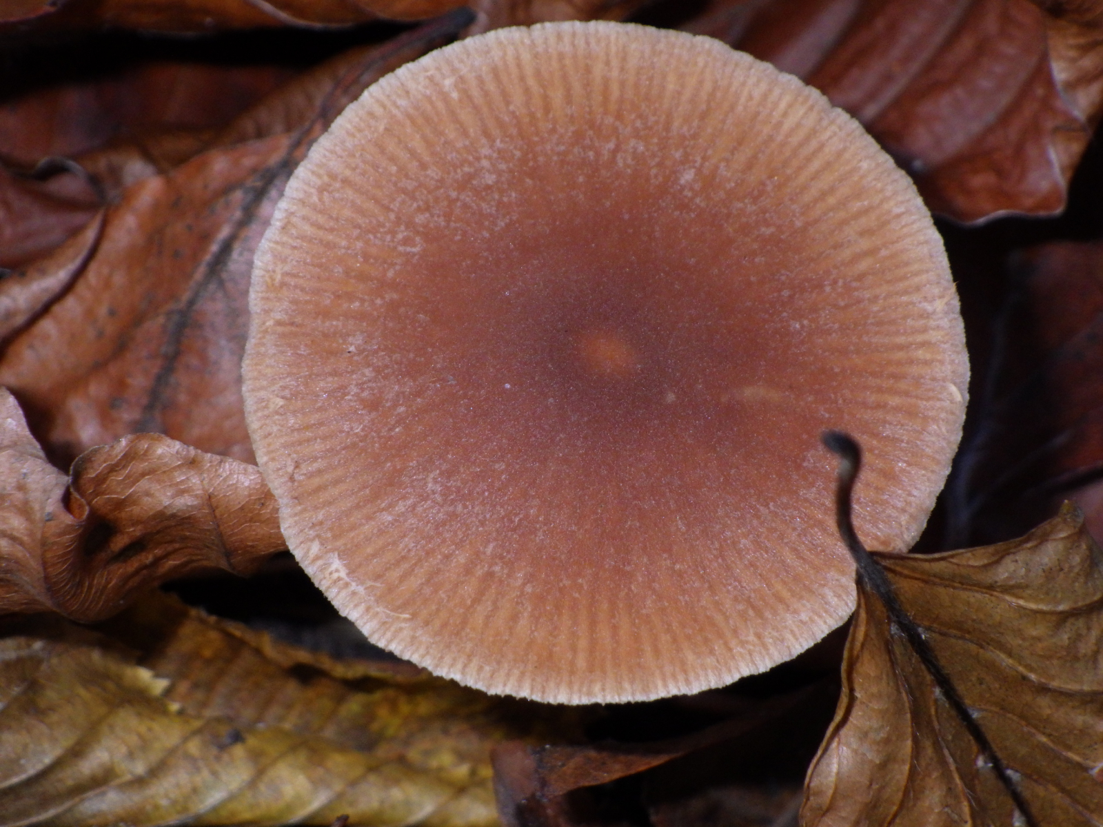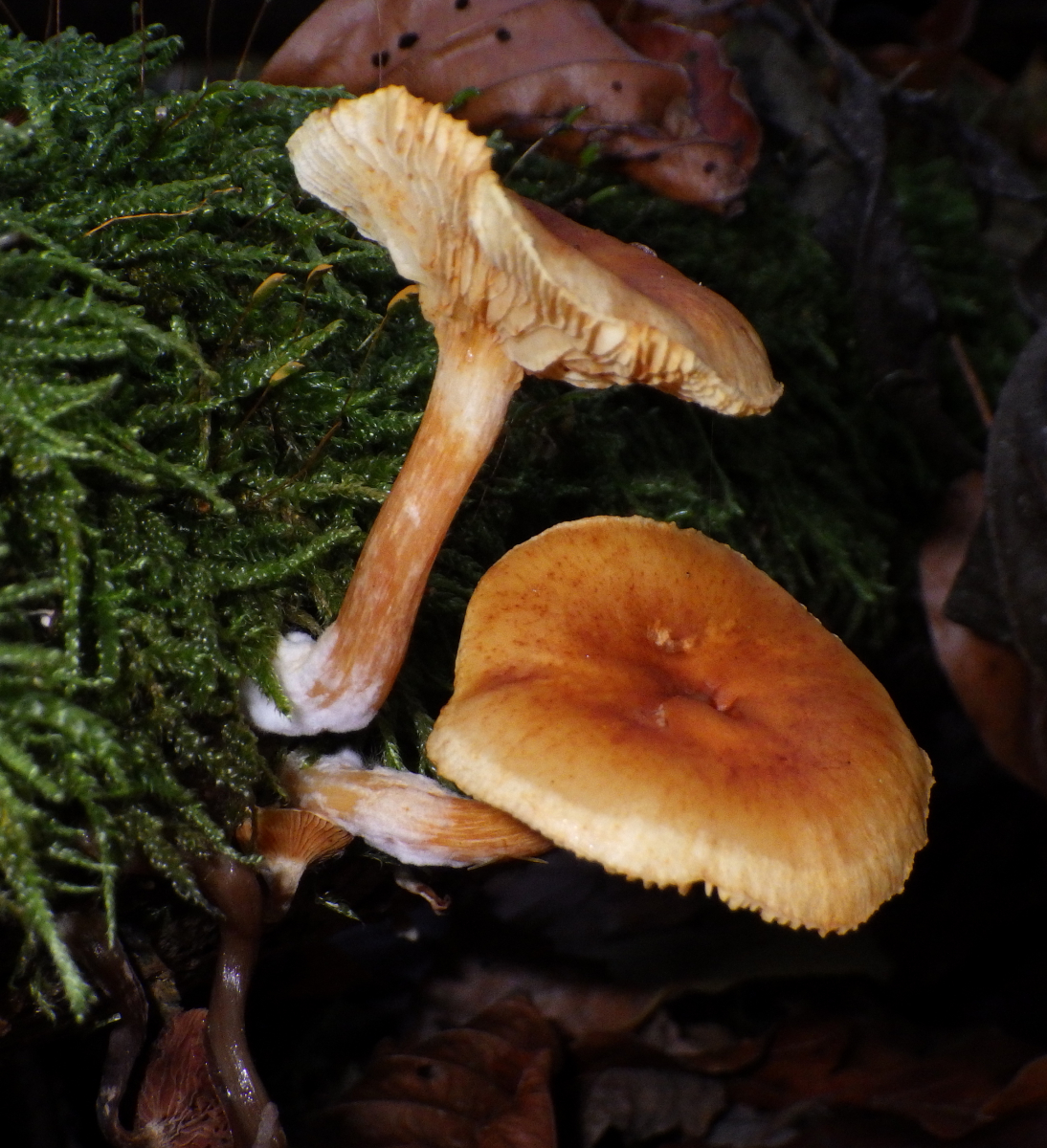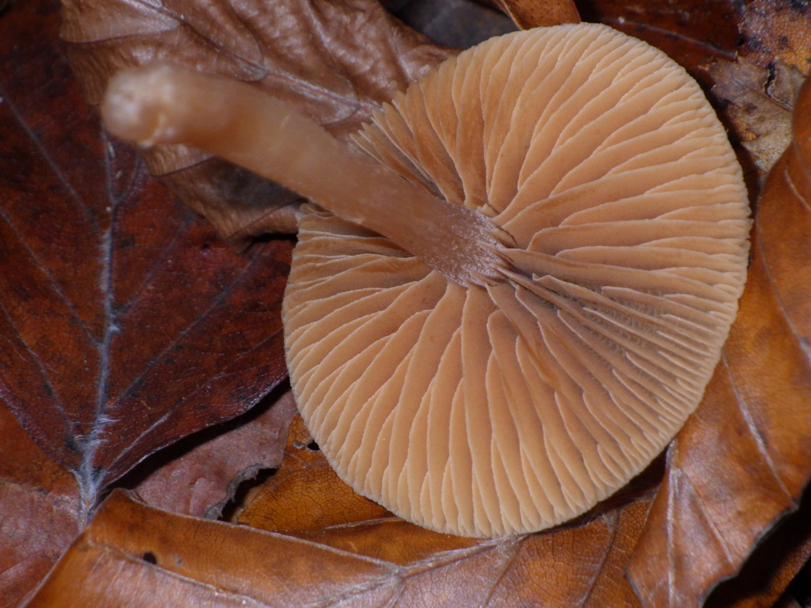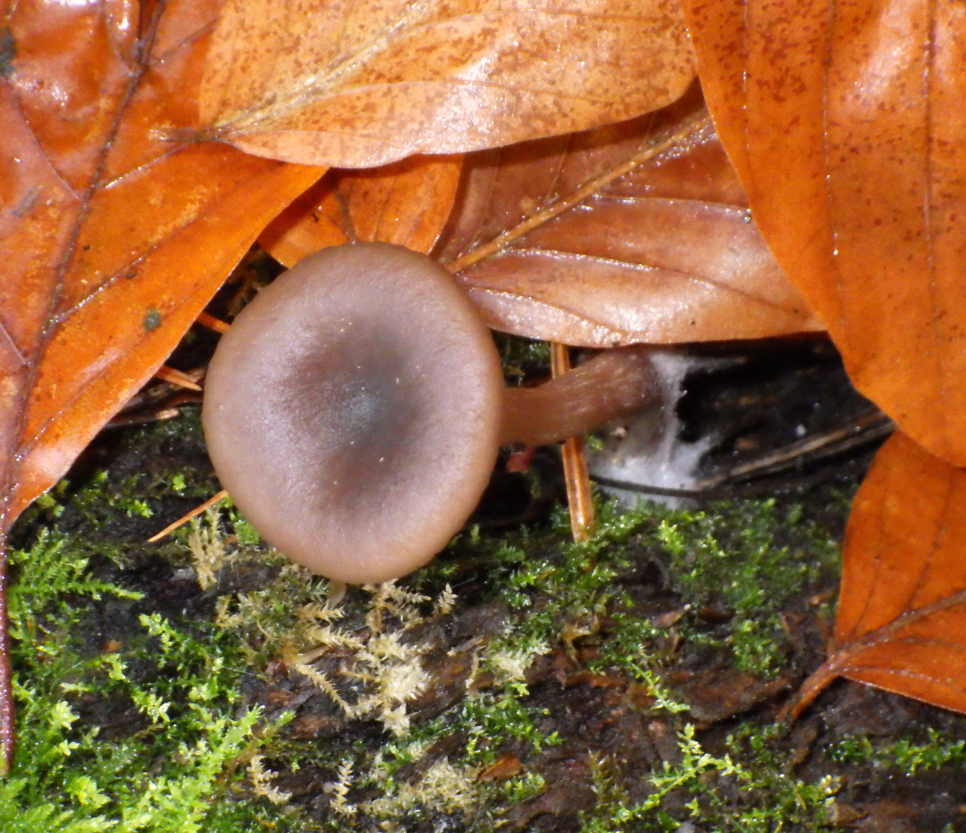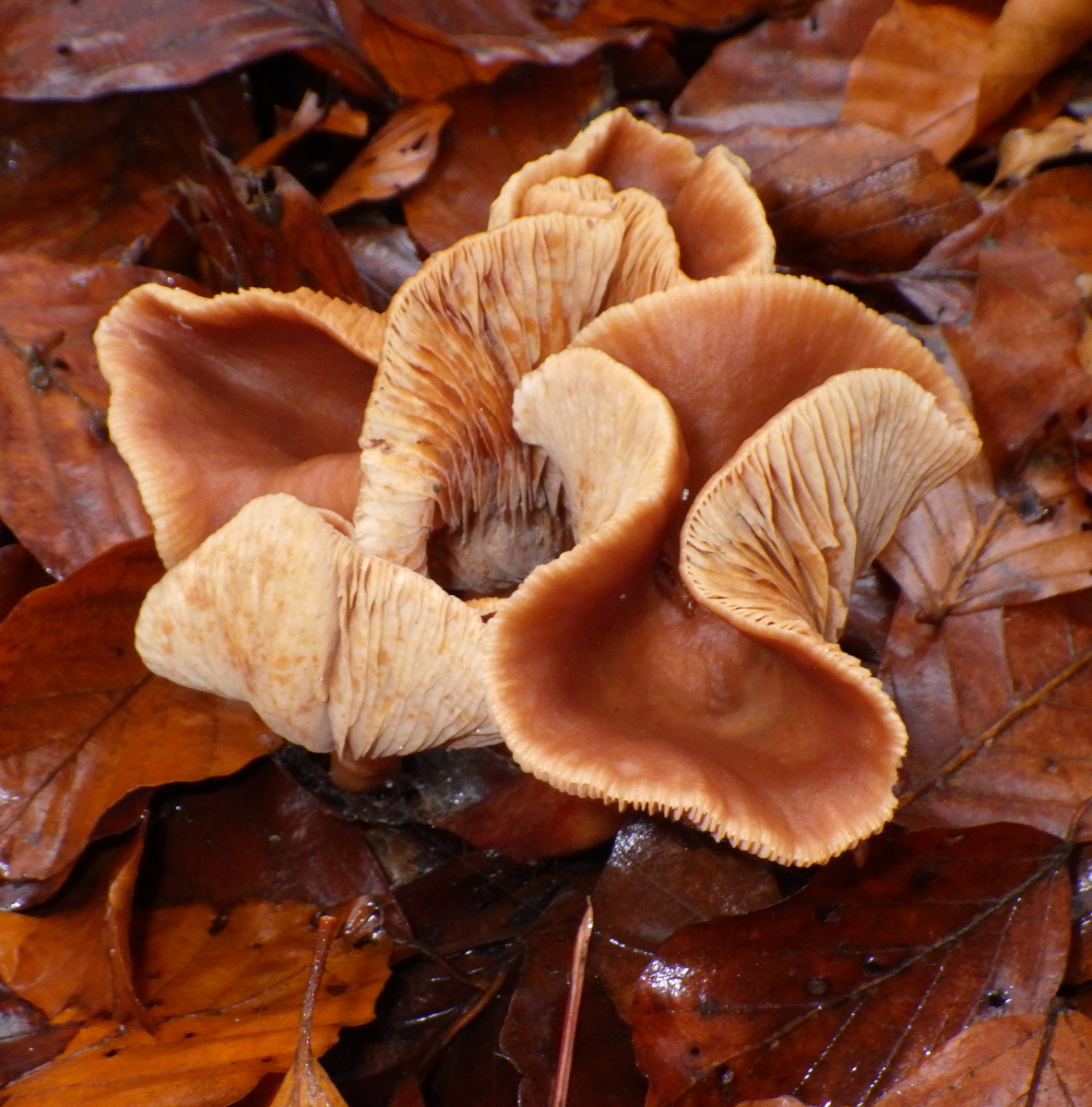2) Trichterlinge: Hellbraune Hüte bis 17cm ø um Buchen teils grosse Hexenringe bildend, eventuell Bleiweisser Trichterling? Hut und Lamellen ohne Milch
