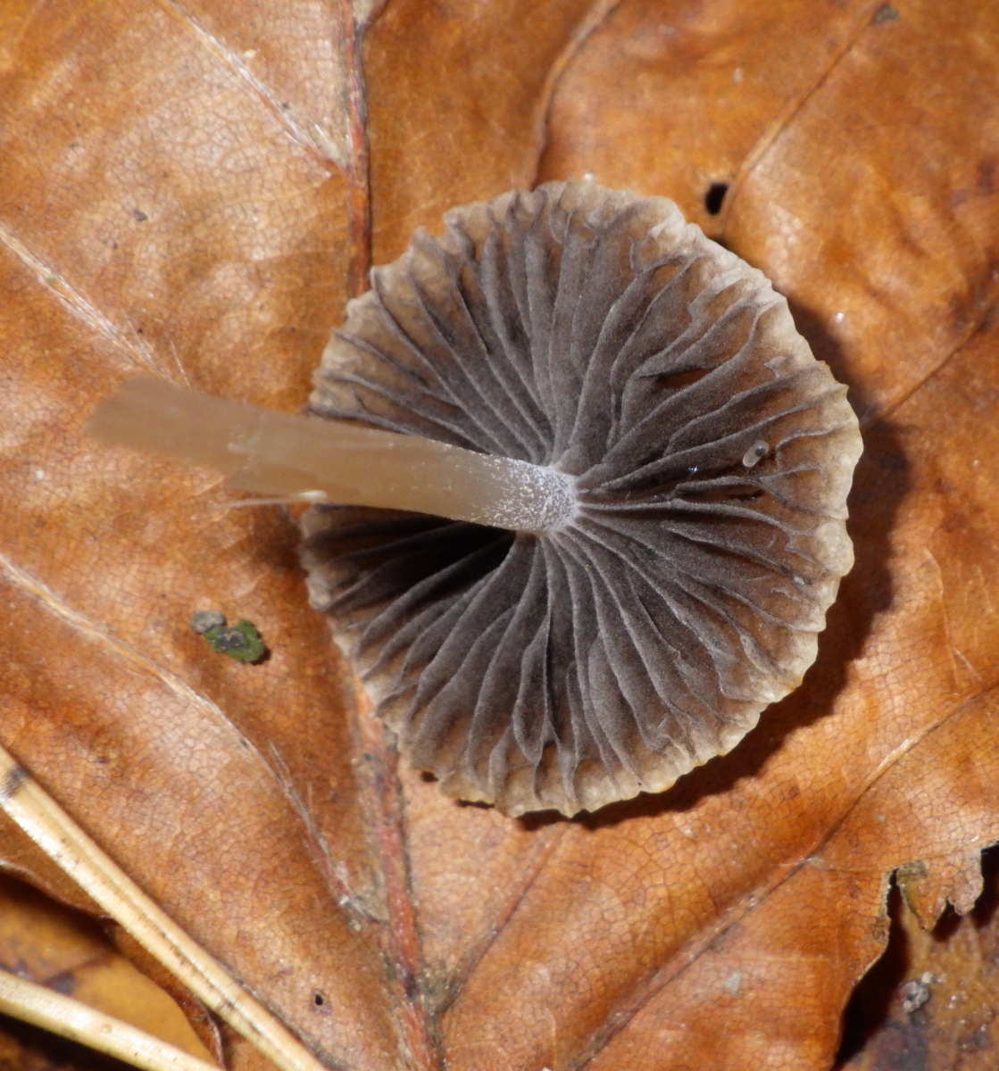 7) Brauner Pilz mit braunen Lamellen, einzeln wachsend aus dem Buchenlaub