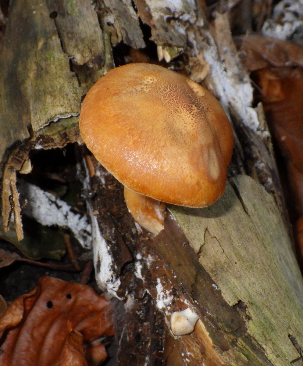 4) Ein Cortinarius Pilz, kann mich aber der grossen Vielfalt wegen nicht für einen sicher entscheiden. Der kräftige dicke Stiel war leicht violett bis braun, die Schnittfläche ohne Verfärbung, leicht violettweisslich und im Zentrum hohl. Der Geruch war intensiv pilzig. Die Lamellen dunkelbraun bis violettlich. Dachte zuerst an einen Breitknolligen Klumpfuss Cortinarius saporatus, wurde aber mit zunehmendem Studium nicht mehr sicher! Die Hüte waren teils sehr gross und ausbreitend um die Buche bildete sich eine recht grosse Gruppe, fast ein Hexenring.