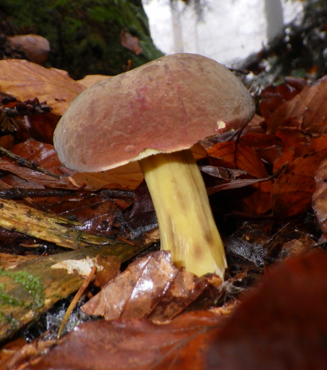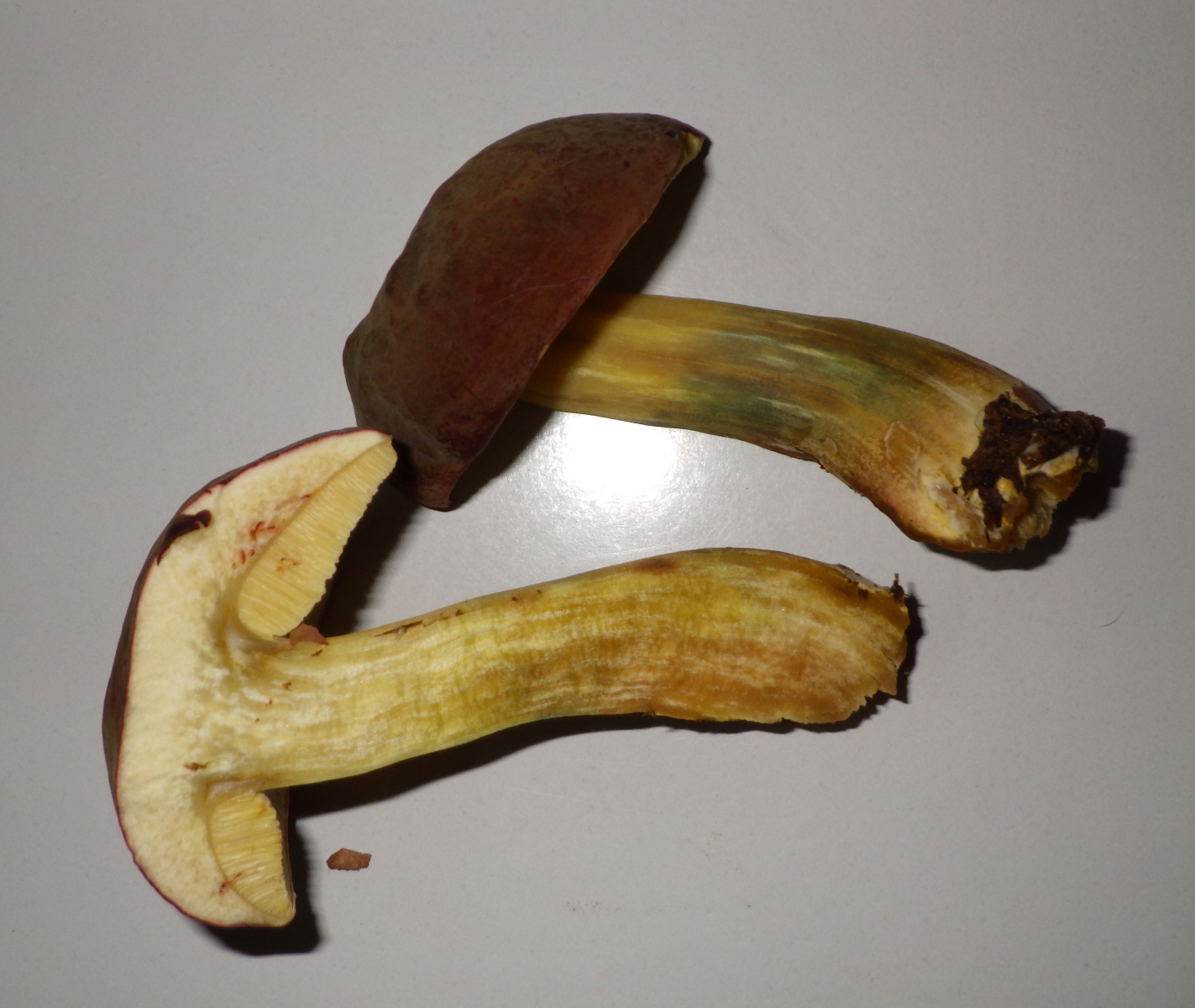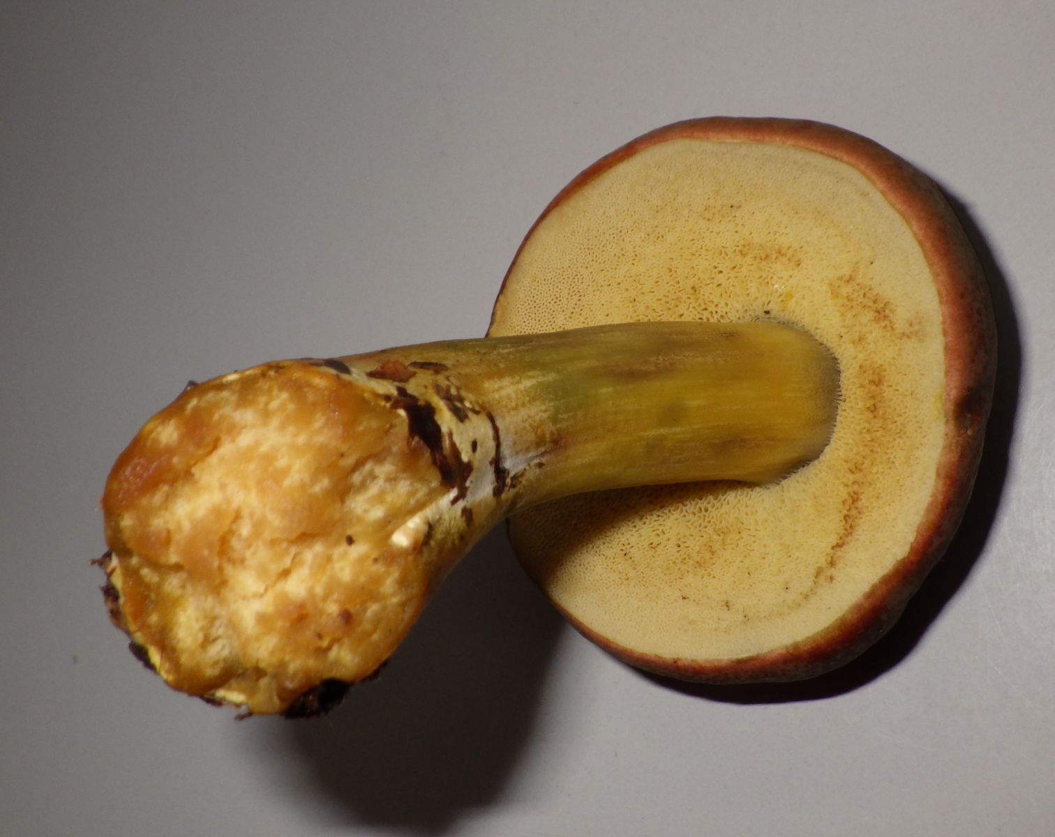 Heute im Maiengrünwald in Hägglingen 550m CH fotografiert, zuerst dachte ich an einen Maronenröhrling mit dem typischen filzigen braunem Hut, der gelbe Stiel und dass die Röhren und das Fleisch nicht blauend sind irritiert mich etwas . Der gelbe Stiel ohne Netzzeichnung wurde jedoch etwas bläulich. Die Röhren blauen auch nach Minuten nicht.