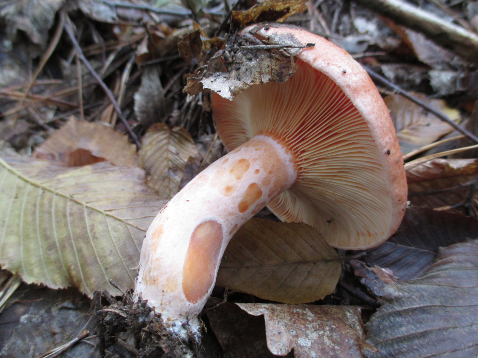 Fundort bei Eichen. Der Stiel war rot überhaucht. Die orangen Flecken im Schnittbild sind vermutlich der Reizkermilch an meinen Fingern zuzuschreiben.
