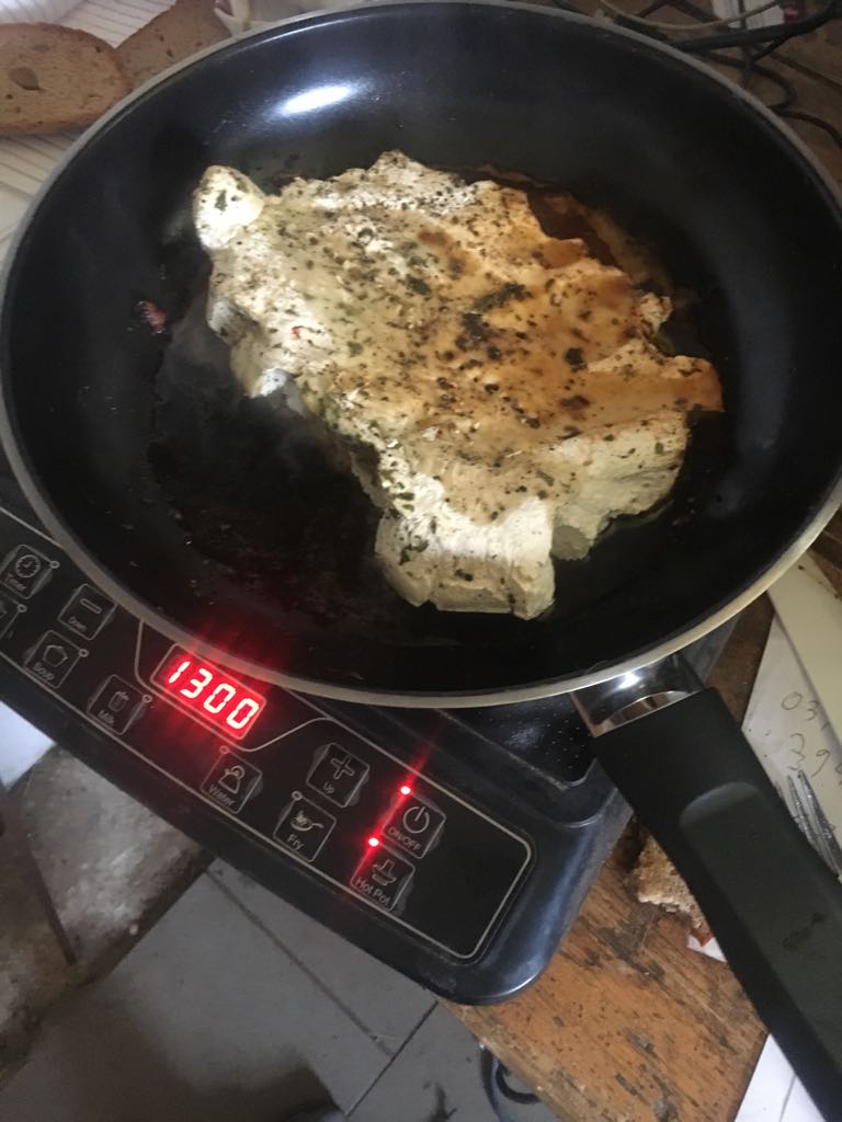 Ich habe nur noch ein Bild, wo der Pilz, besser gesagt ein anderer, der an der gleichen Stelle gefunden wurde, zubereitet in der Pfanne liegt.