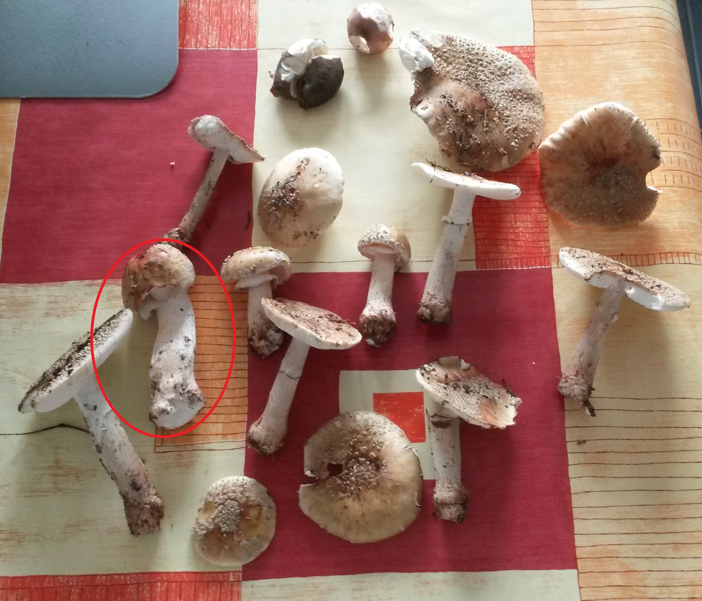 Jetzt habe ich noch eine Frage an euch: Mir ist aufgefallen, dass ein Perlpilz wesentlich größer, dickfleischiger und komplett Madenfrei war. Diesen Pilz (rotes Oval in Bild 1) habe ich im Gegensatz zu allen anderen in einem Laubwald gefunden. In Bild 2 sind zwei Perlpilze die ich letztes Jahr in einem Laubwald gefunden habe zu sehen. Beide waren ebenfalls madenfrei. Man beachte die enorme Größe (ca. 15 cm Höhe) im Vergleich zum relativ kleinen Parasol oder der "Monstermarone" links oben