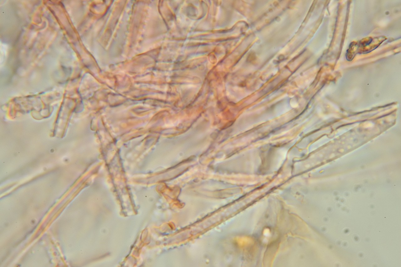 Leptozystiden mit mehreren aufgelagerten Kristallen unterhalb der Verjüngung