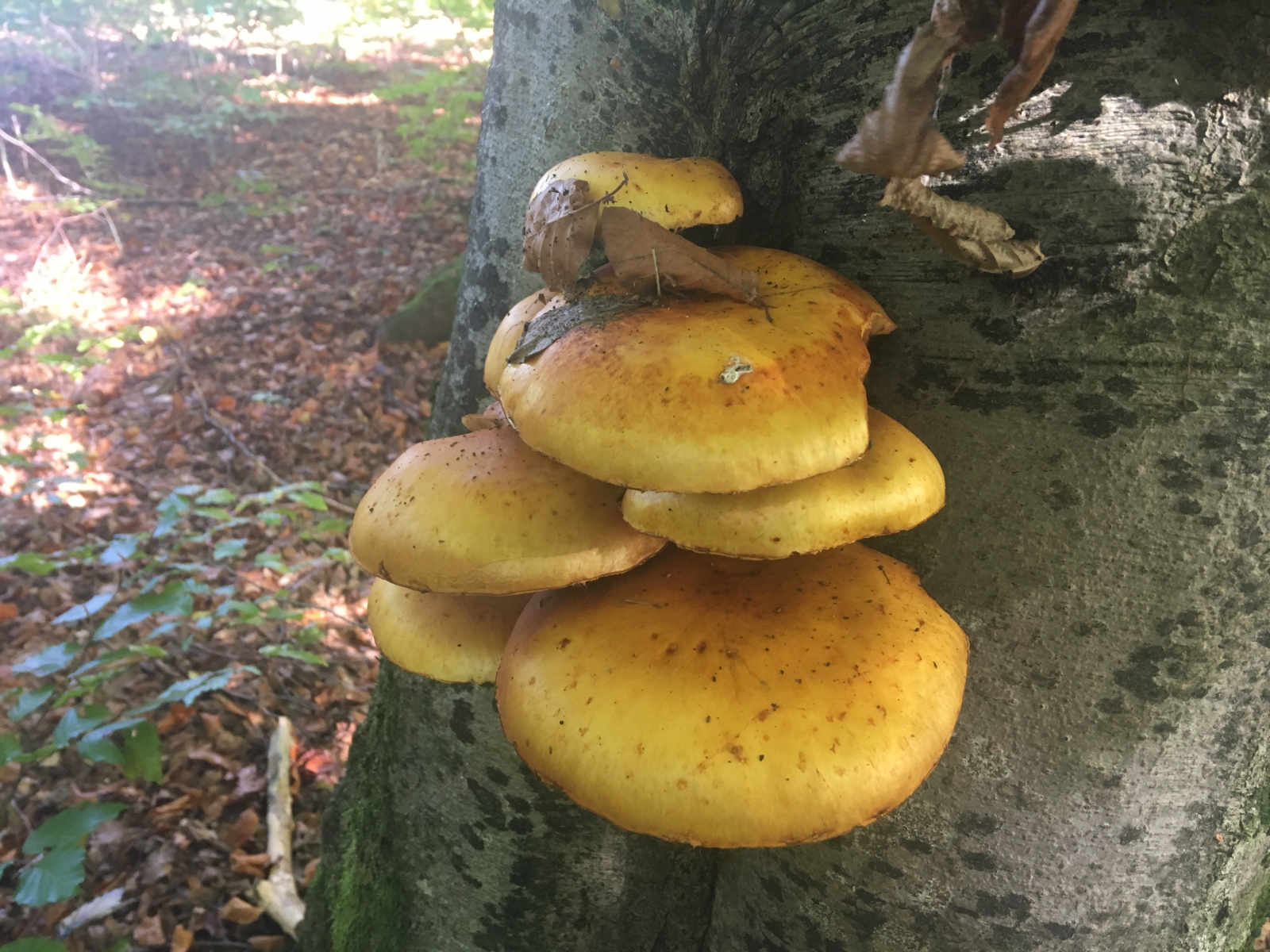 Pilz 1 wuchs an einer lebenden Buche. Geruch eher unauffällig. Dachte an einen Flämmling. Aber wachsen die an