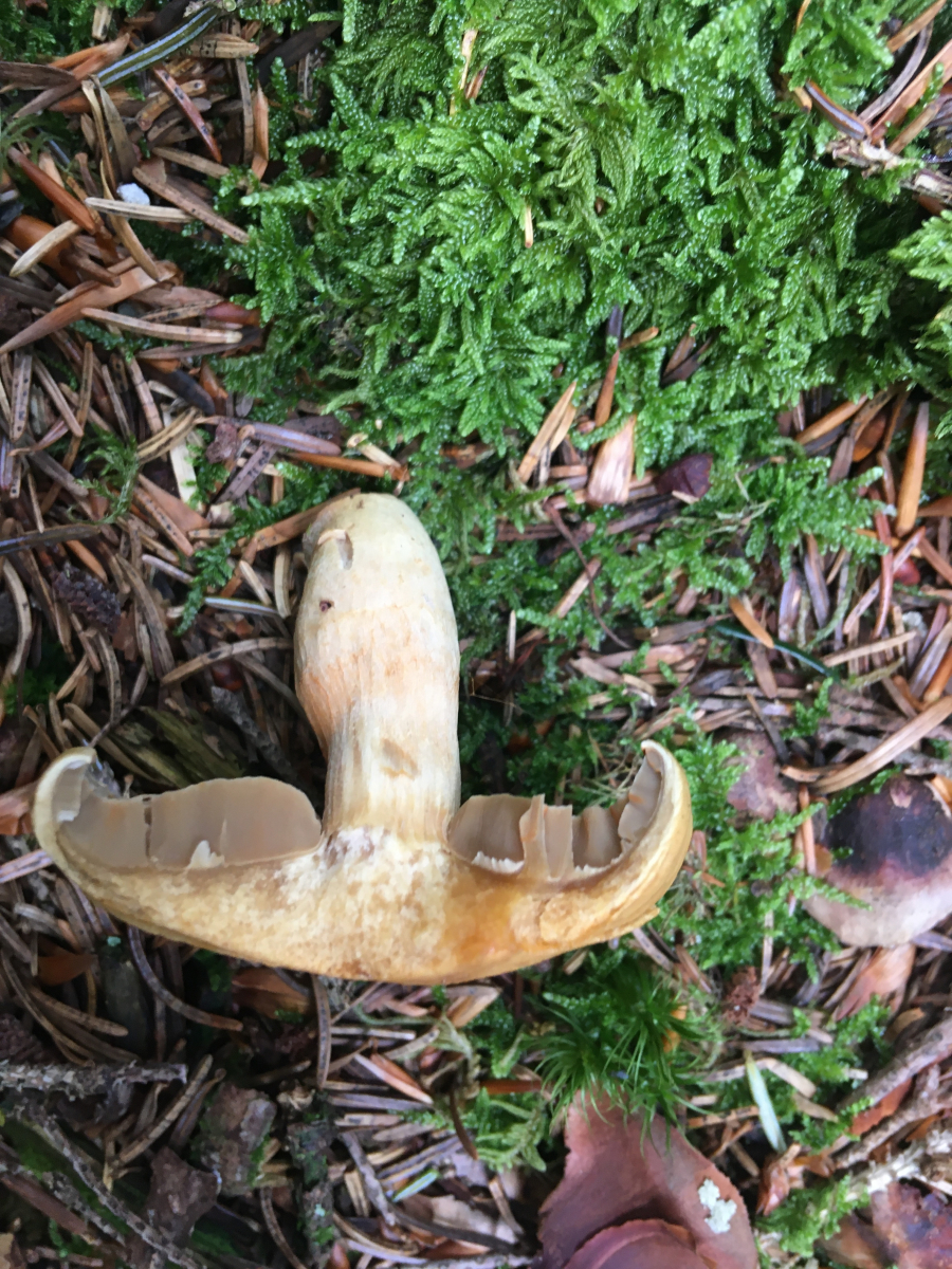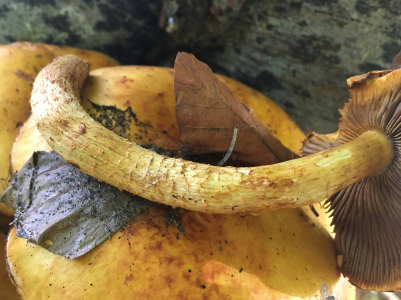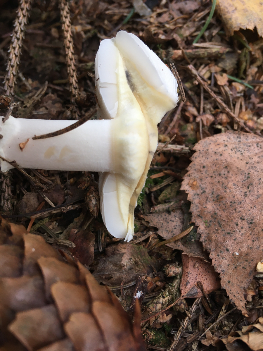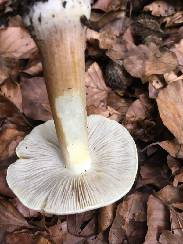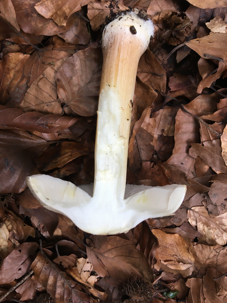 Wuchs unter Hainbuchen, Rotbuchen und Ahorn. Auffallend war die gelbe Färbung der Stielbasis wogegen der Rest des Pilzes nur schwach gilbte bei Berührung wenn überhaupt.Geruch war seltsam. Mich erinnerte der irgendwie an ein Schlauchboot oder Luftmatratze irgendwie künstlich der Geruch. Könnte das in Richtung Karbon gehen?