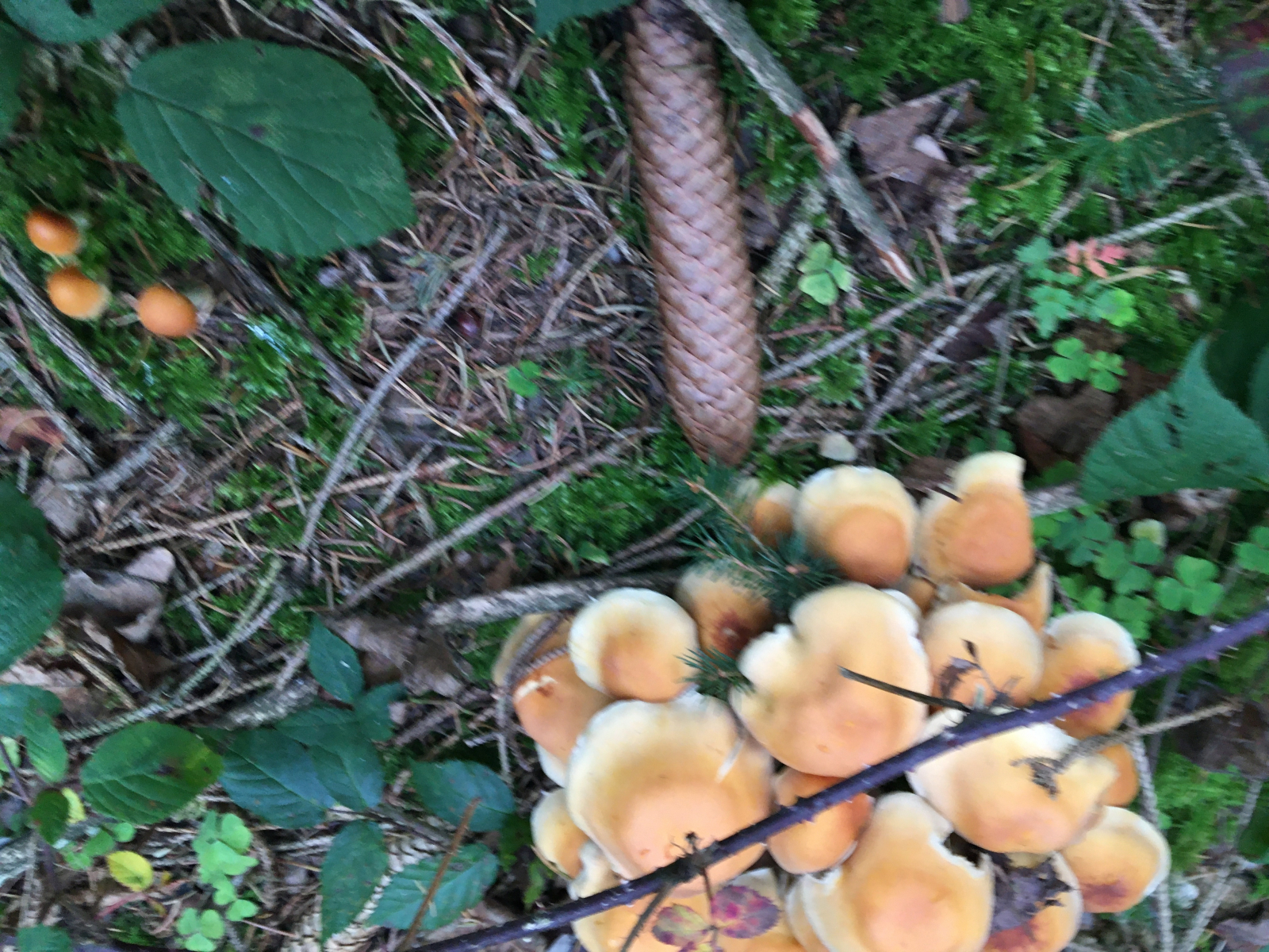 Pilz 1 meiner Meinung nach der gelbe Knollenblätterpilz. Zwei Exemplare waren sichtbar.Nur mit der Stielbasis bin ich mir unsicher. Die ist in meinen Büchern gleichmäßiger rund?Könnte Pilz 2 ein wurzelnder Schwefelkopf sein? Geruch war angenehm. Wuchs teilweise auf holzstumpf teilweise scheinbar am boden.