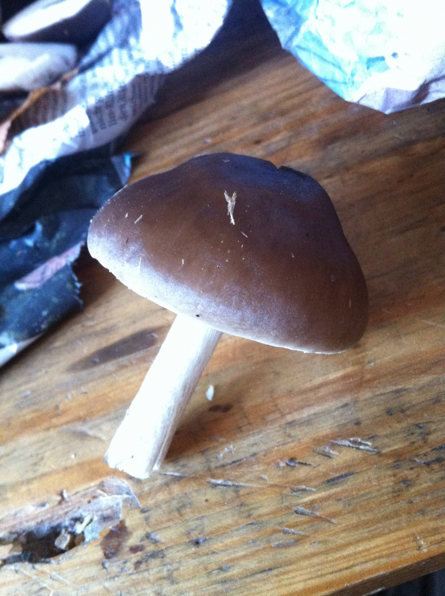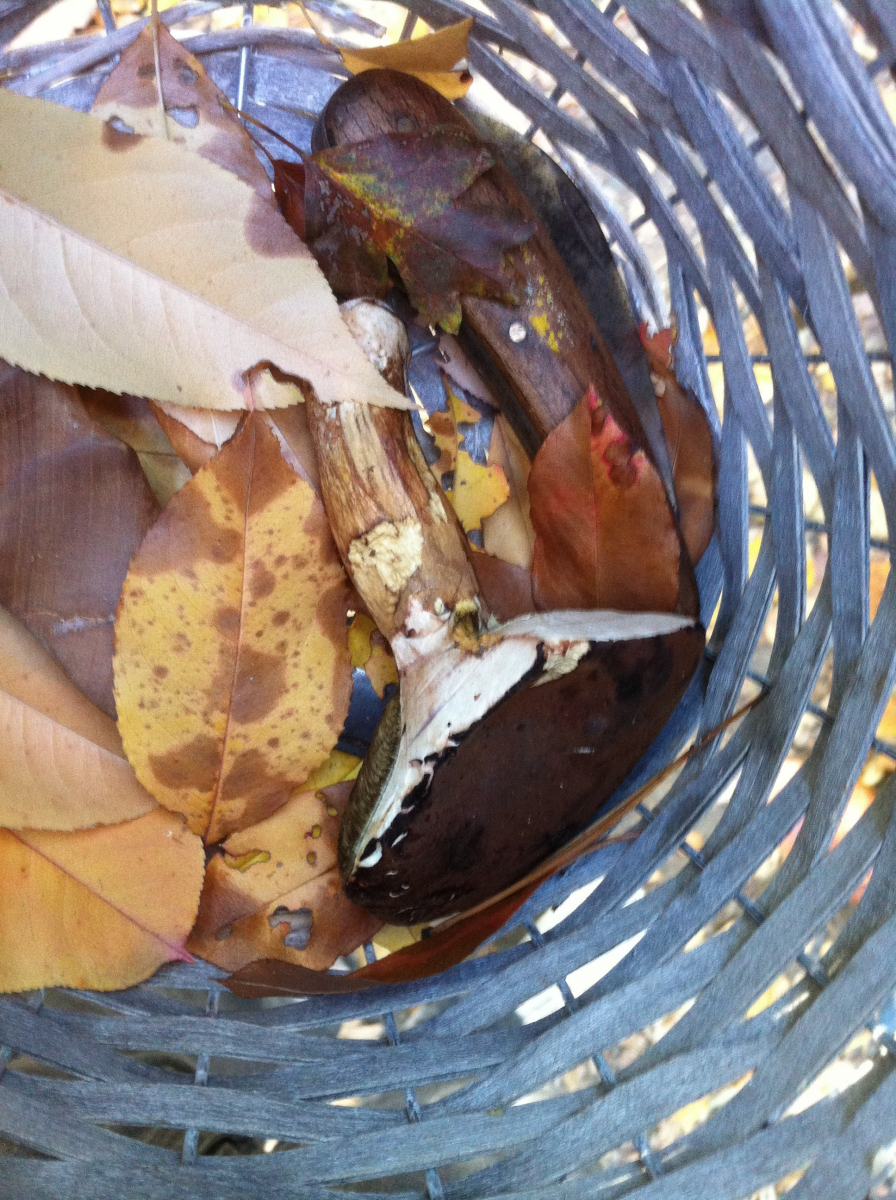 Die Marone hat sich auf Druck eindeutig blau verfärbt. Und hatte beim Anschneiden einen typischen Geruch den ich noch aus Kindestagen kenne. Auf dem Bild ist sie angeschnitten, da ich den Rest im Wald gelassen habe.