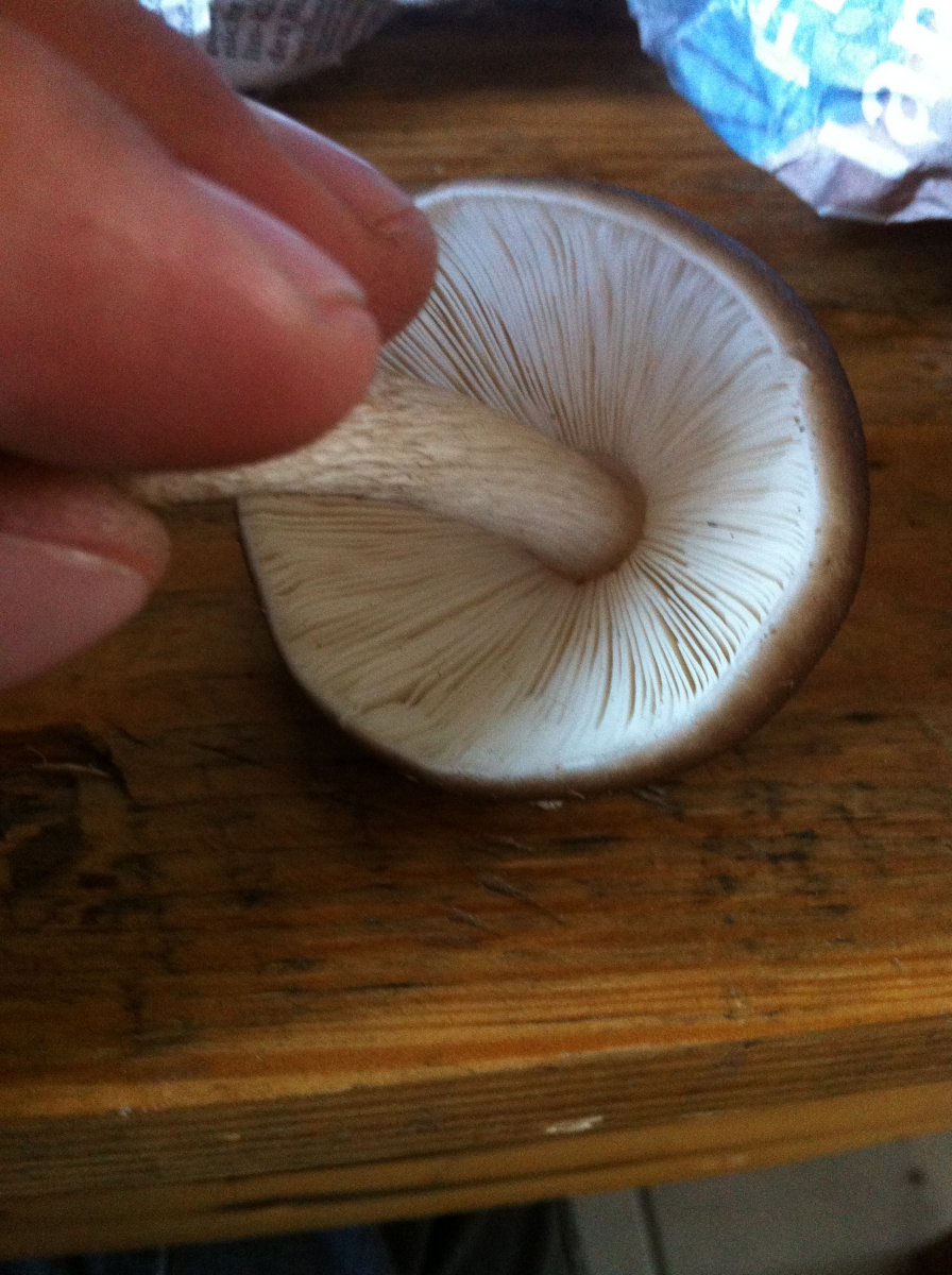 Die "Dachpilze" oder der "breitblättrige Rübling" wuchsen oben auf einem verrotteten Baumstumpf. Die Lamellen an sich stehen frei, der Stiel bricht längsfaserig, ist mit bräunlichen länglichen Fasern überzogen und bleibt nach dem Anschnitt weiß. 2 der Pilze waren madig. Die Hüte waren teilweise buckelig und die Huthaut ließ sich abziehen. Die Rosa Färbung der Lamellen, habe ich auch schon bei älteren Dachpilzen gesehen, jedoch bei diesen bisher nicht und habe das auf das junge Stadium der Fruchtkörper geschoben. Frisch waren die Lamellen außerdem sehr eng und geordnet aneinander, das Exemplar auf dem Bild ist bereits 2 Stunden alt. Daher wahrscheinlich die Veränderung bei den Lamellen.
