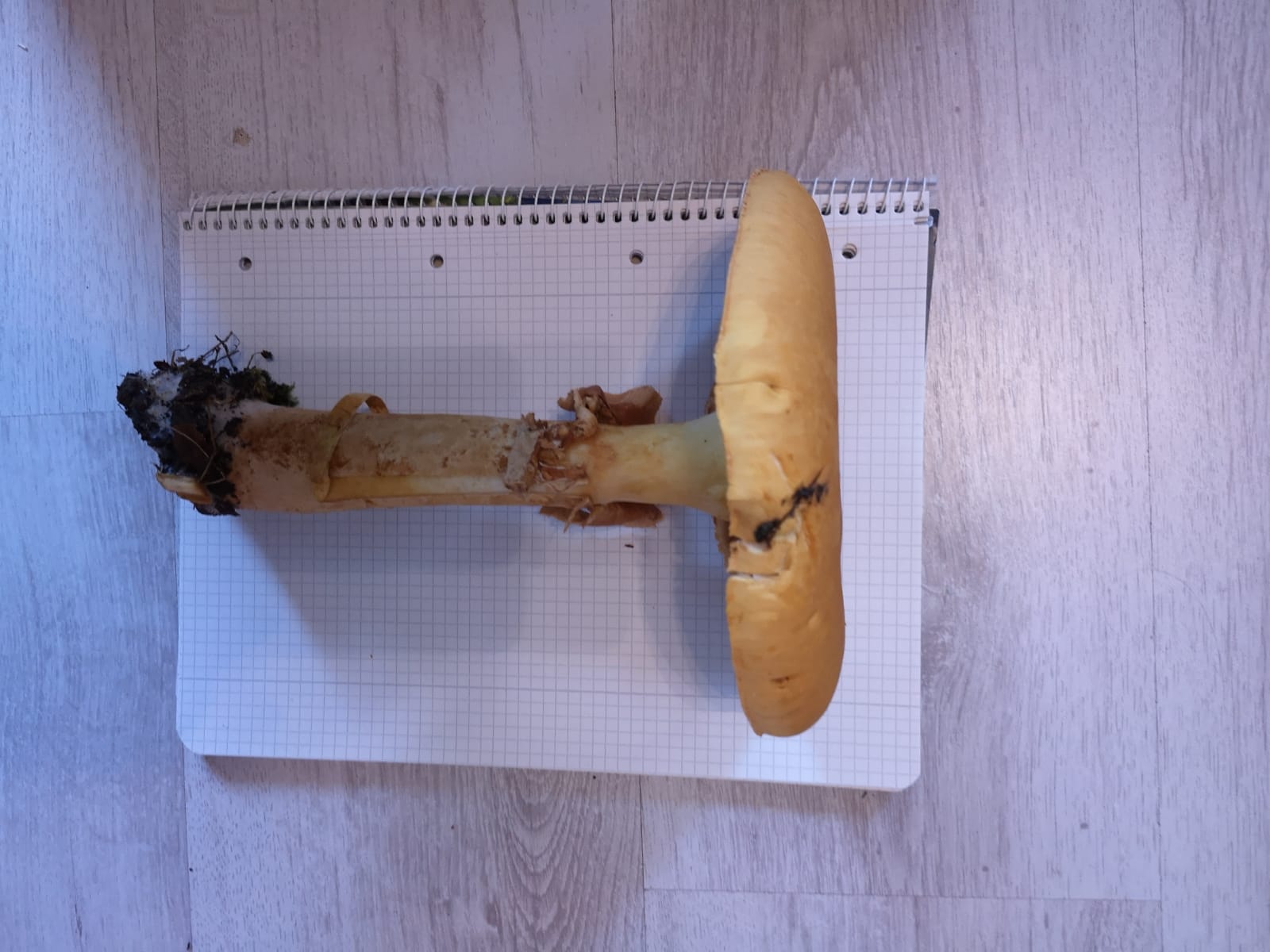 15- 20 cm Deckel, Größe wie Parasol Pilz, dicker Stamm ca. 2-3 cm. Riecht angenehm nussig ähnlich wie das Stockschwämmchen. Färbt leicht ab wenn man ihn anfasst.