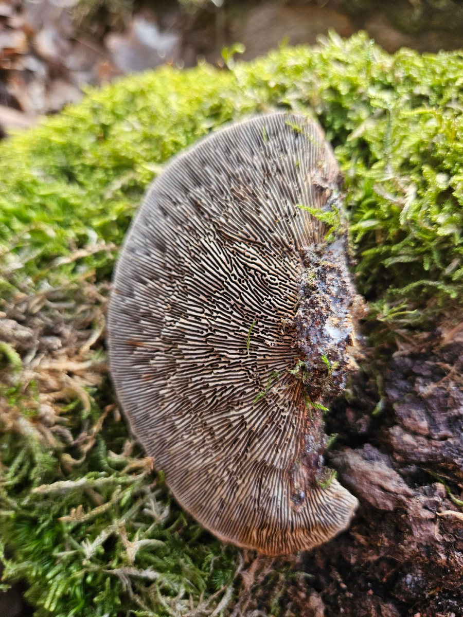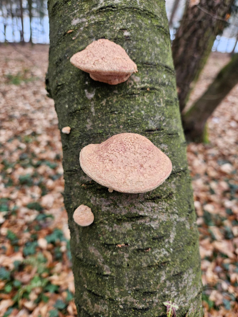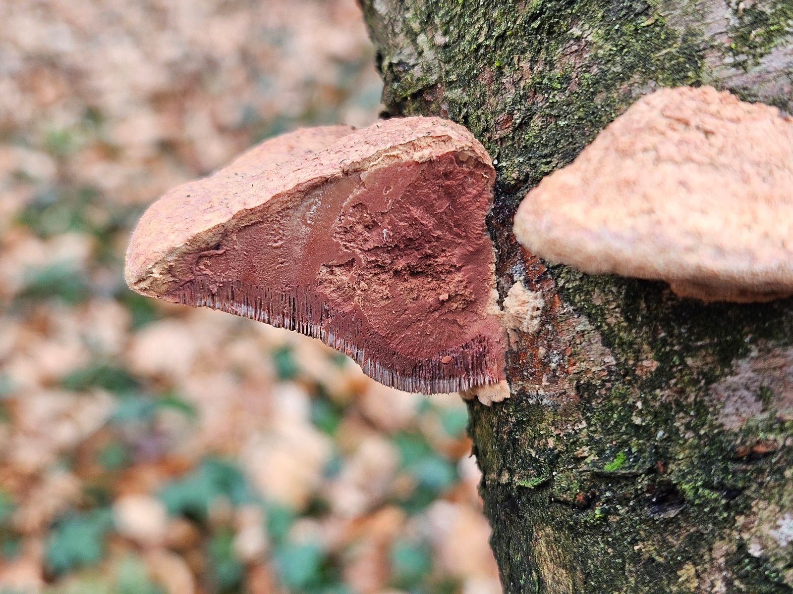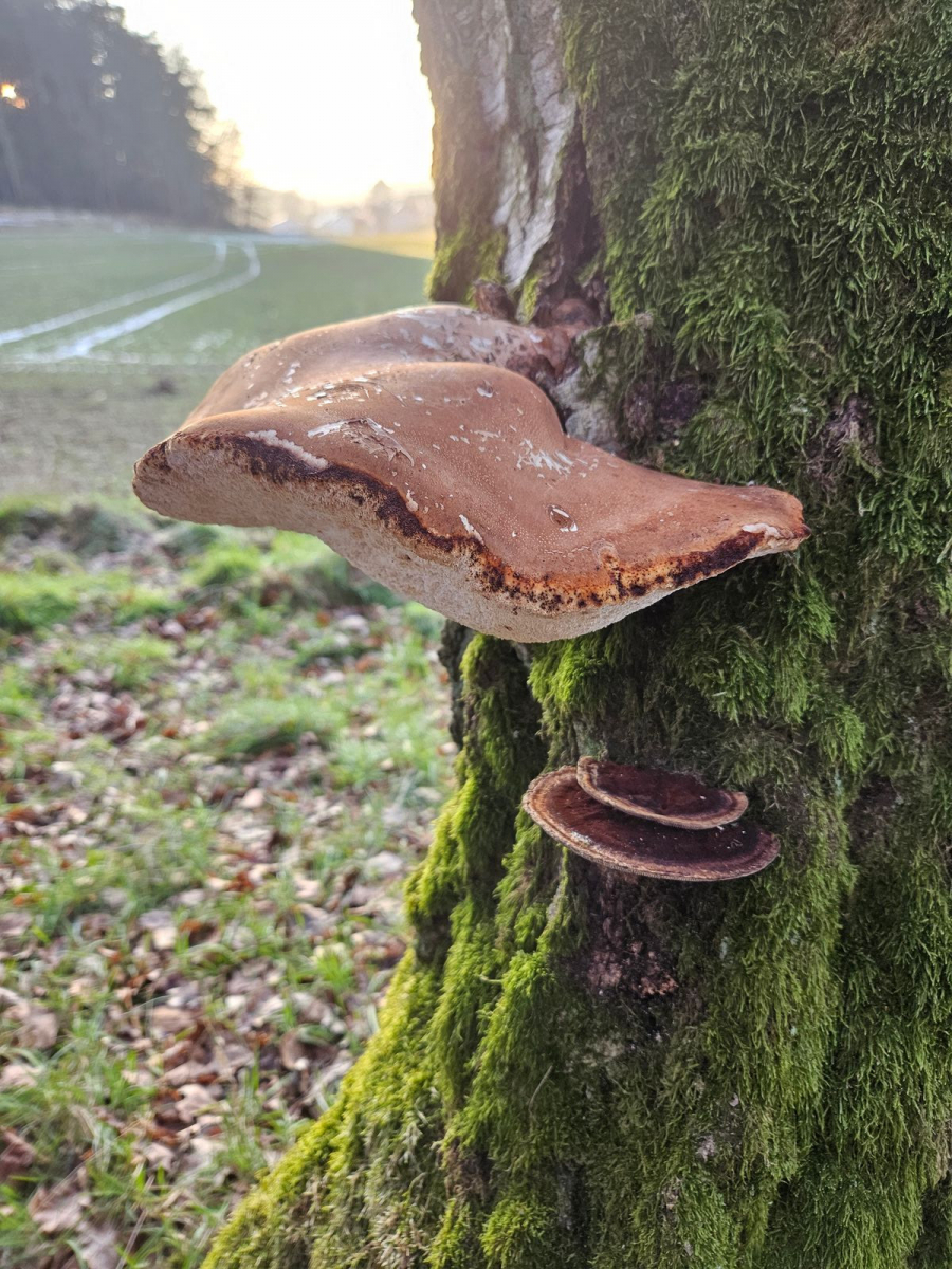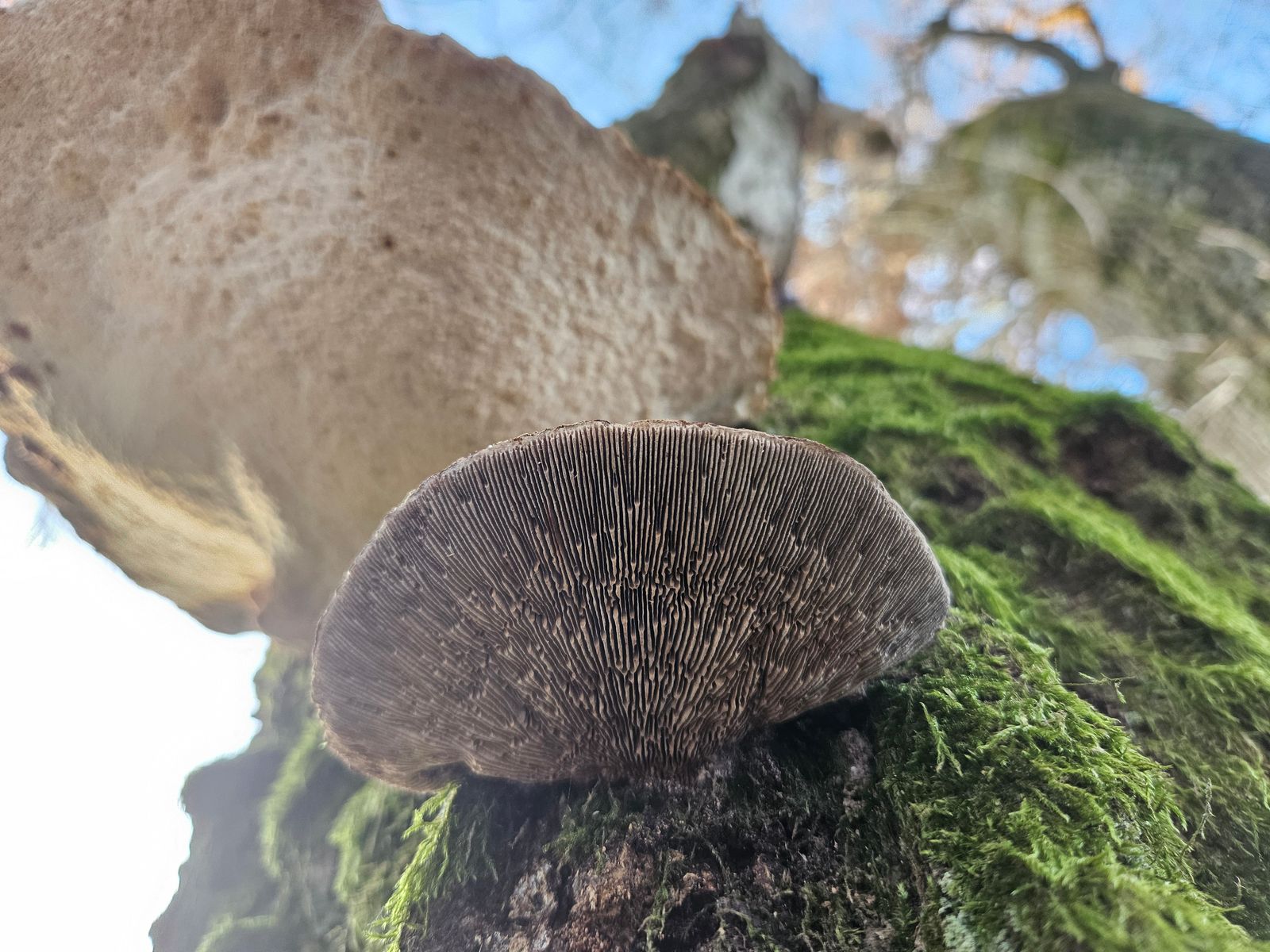 Als ich die Umgebung ganz genau nach weiteren Rauhfüssen abgesucht habe, ist mir auch der ganz unten angefügte Fruchtkörper aufgefallen. Gleich vorab, ich habe ihn nicht mitgenommen und habe weder vor so etwas zu konsumieren noch irgend etwas anderes damit zu tun. Mich interessiert es einfach nur.