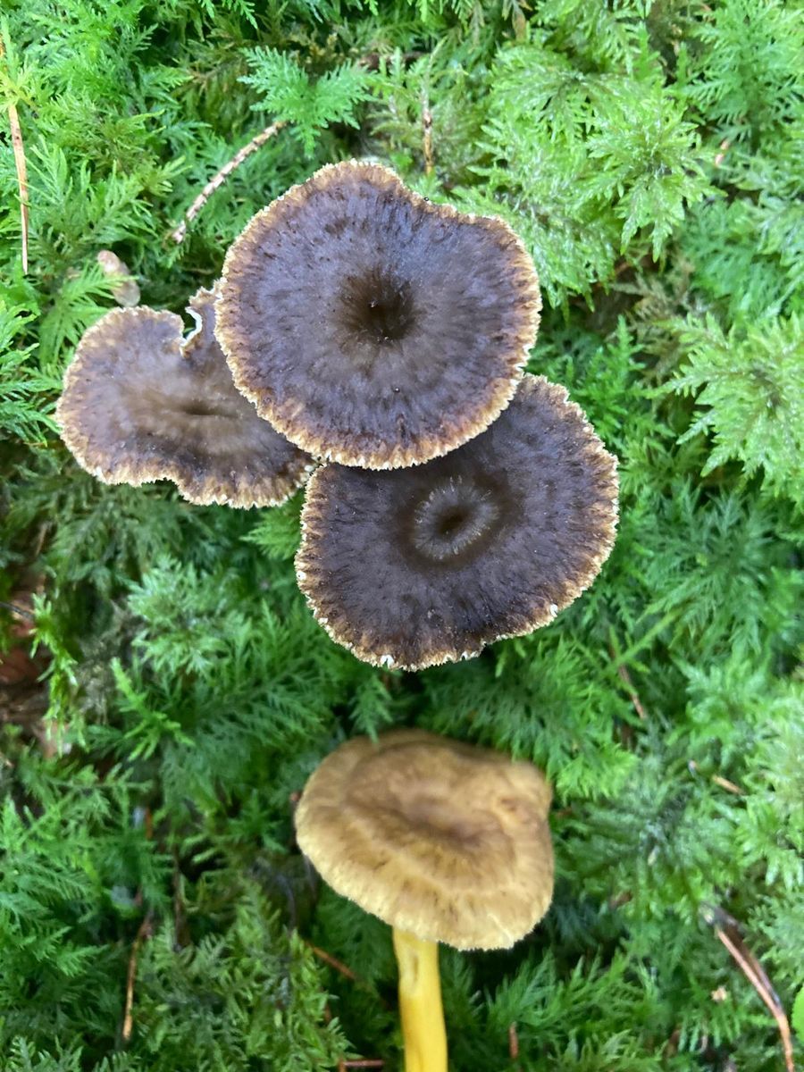 Der ganze Wald ist übersät mit Trompetenpfifferlingen, aber manche waren deutlich dunkler und tanzten somit aus der Reihe. Ich habe bei den ersten drei Bildern zum Vergleich einen helleren daneben gelegt, von welchen es deutlich mehr gab als von den dunkleren. Sind beide dieselbe Art?