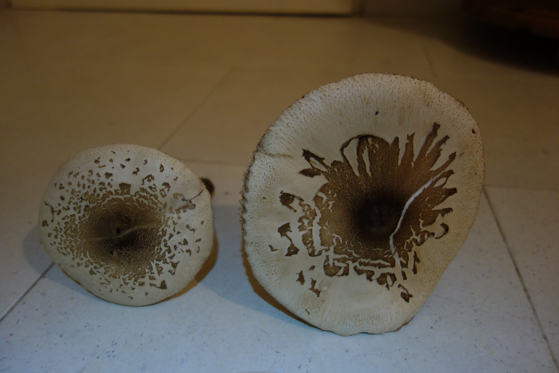 Hut recht groß (ca. 15 cm, der zweite etwas kleiner), auf hellem Grund mit dunkler braunen Schüppchen, Mitte mit dichtem braunen Punkt und stumpf gebuckelt.