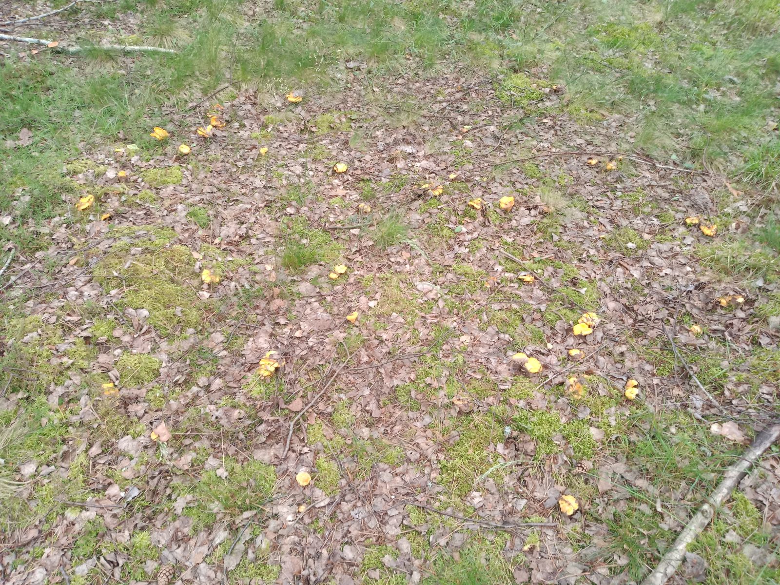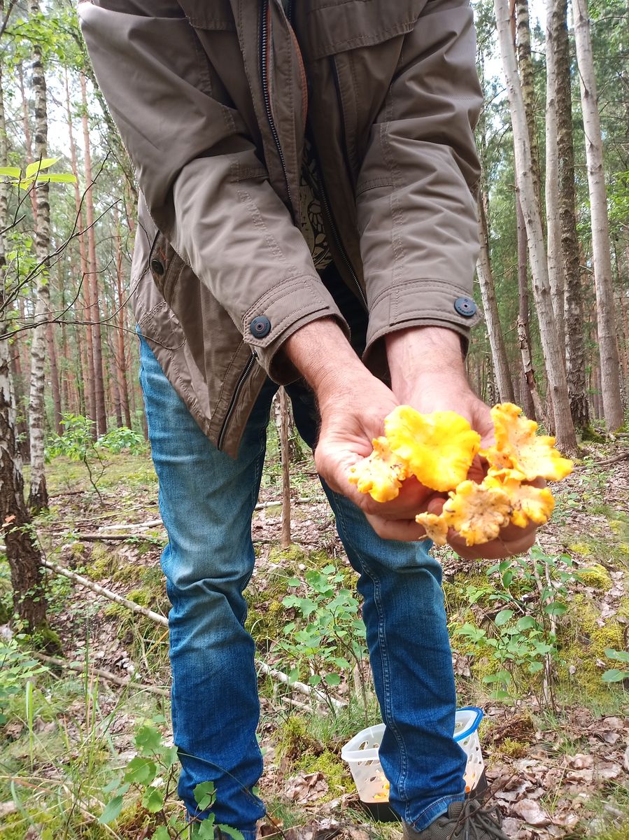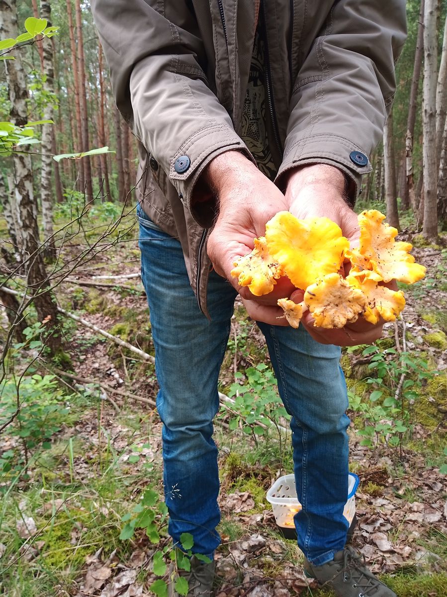 bin also gstern zu zweit zu meiner Frühwachspfefferlingslocation gefahren. Dort war alles noch sehr feucht von dem vielen Regen. Auf der Wegstrecke dorthin gab es Stinkmorcheln, nicht zu überriechen, Scheidenstreiflinge und zum ersten mal sehr viele Walderdbeeren. Dann angekommen, waren schon aus gewisser Entfernung gelbe Flecken zu sehen. Niemand hatte dort zuvor geerntet. Es gab viele voll ausgewachsene Pfifferlinge, ziemlicht feucht, einige hätte man schon eher ernten sollen. Ich habe zu diesem Zeitpunkt noch niemals richtige Mahlzeiten zusammenbekommen. Es hat für 3 Mahlzeiten zu zweit gereicht.