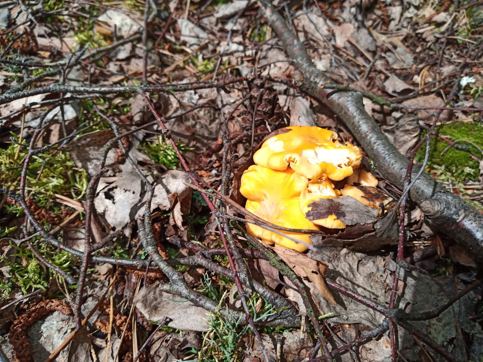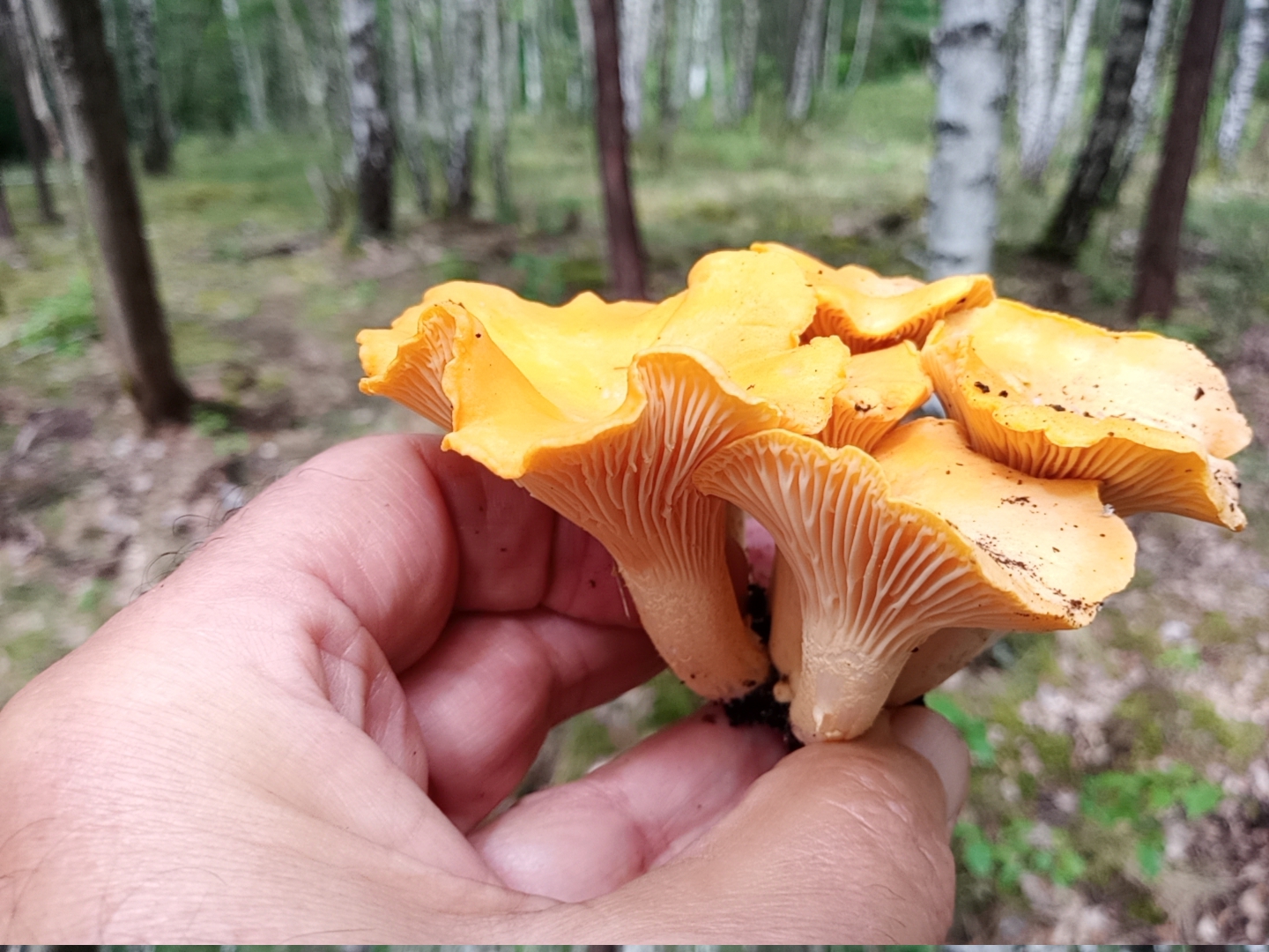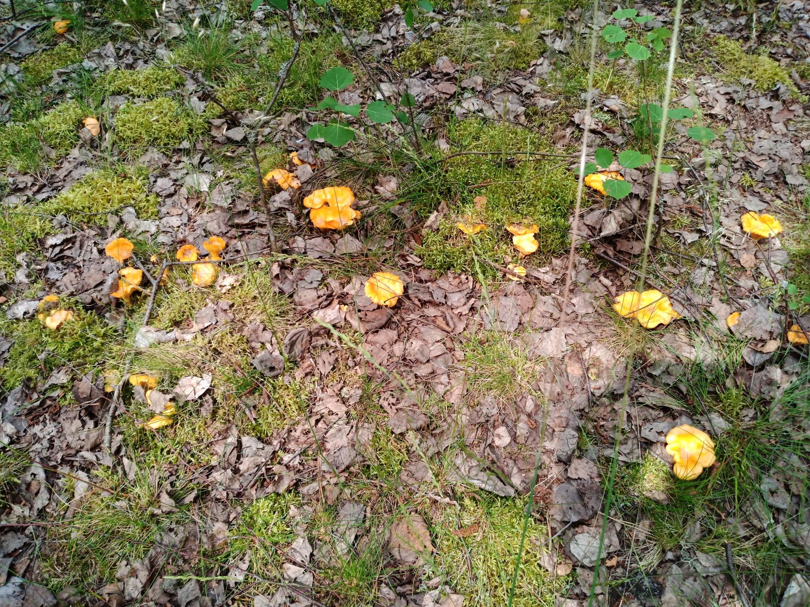 bin also gstern zu zweit zu meiner Frühwachspfefferlingslocation gefahren. Dort war alles noch sehr feucht von dem vielen Regen. Auf der Wegstrecke dorthin gab es Stinkmorcheln, nicht zu überriechen, Scheidenstreiflinge und zum ersten mal sehr viele Walderdbeeren. Dann angekommen, waren schon aus gewisser Entfernung gelbe Flecken zu sehen. Niemand hatte dort zuvor geerntet. Es gab viele voll ausgewachsene Pfifferlinge, ziemlicht feucht, einige hätte man schon eher ernten sollen. Ich habe zu diesem Zeitpunkt noch niemals richtige Mahlzeiten zusammenbekommen. Es hat für 3 Mahlzeiten zu zweit gereicht.
