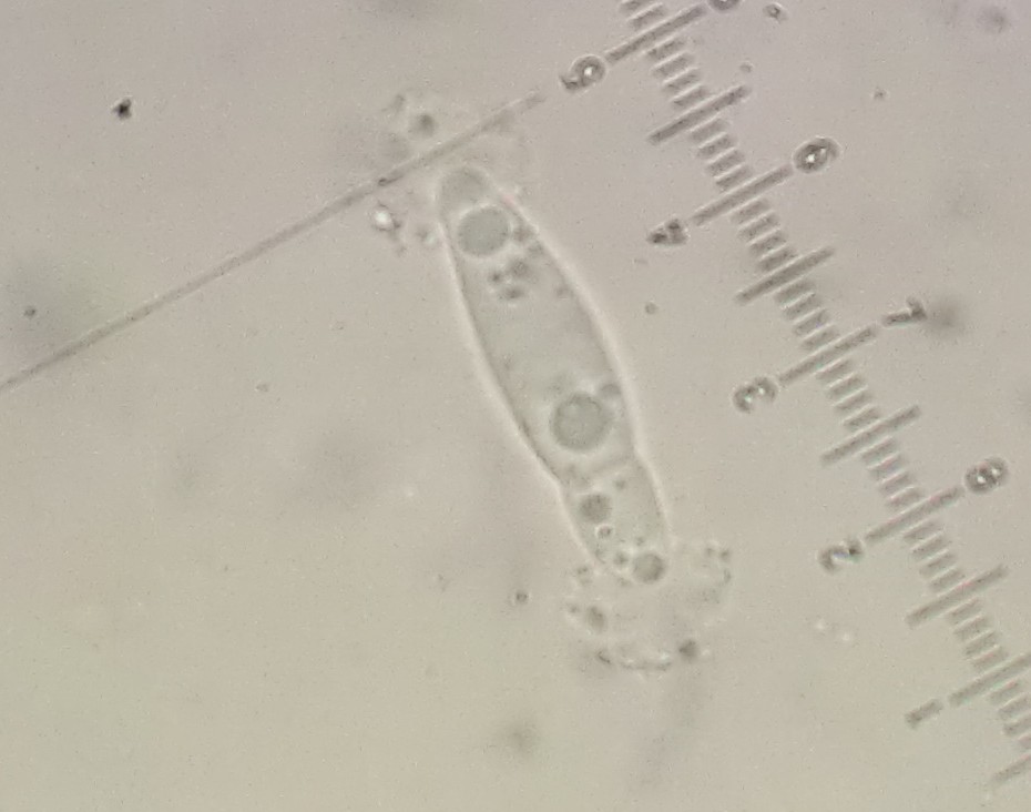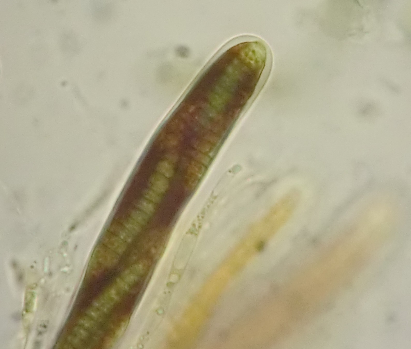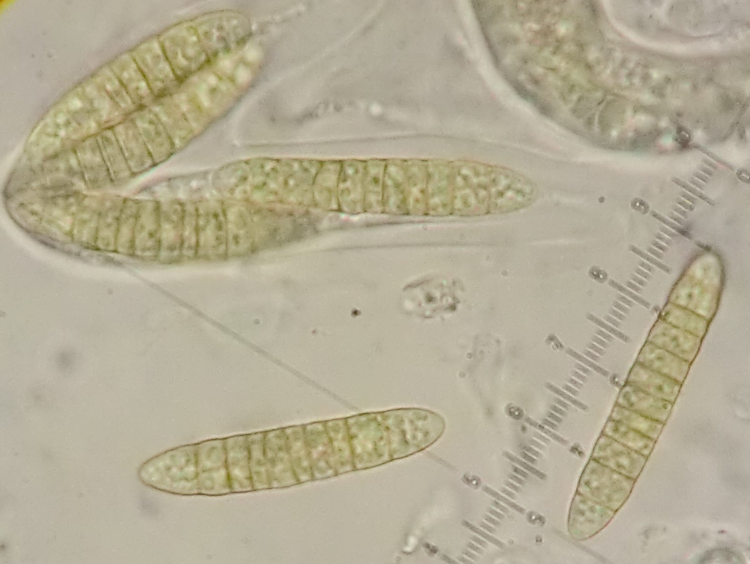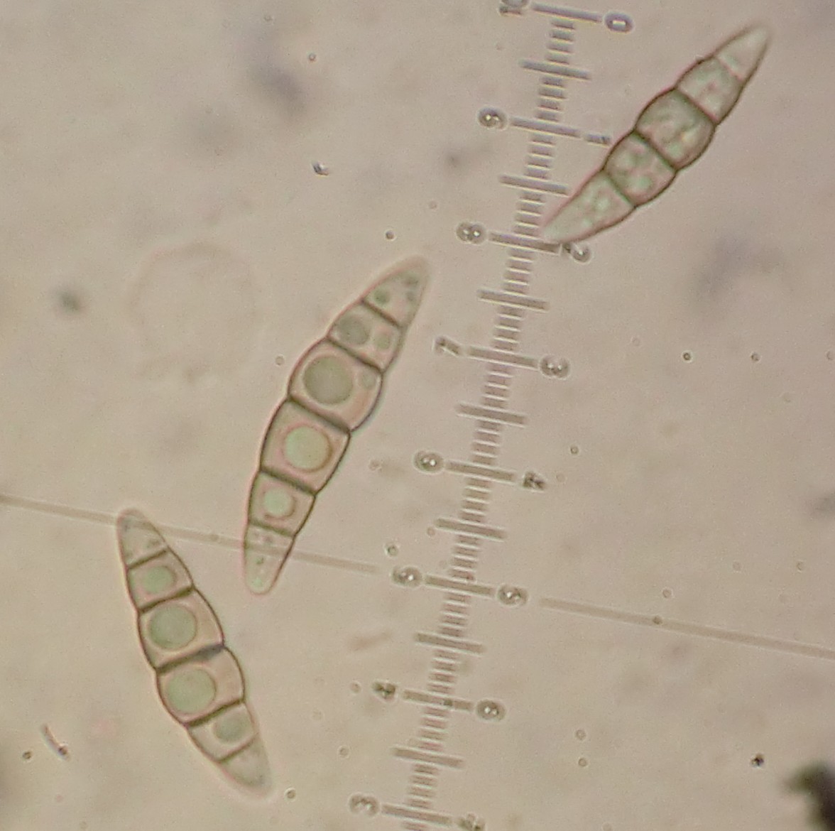 Sporen 35 - 44 x 6 - 7 µm, reif gelb-bräunlich gefärbt, mit 9 - 11 Septen (unten in IKI)