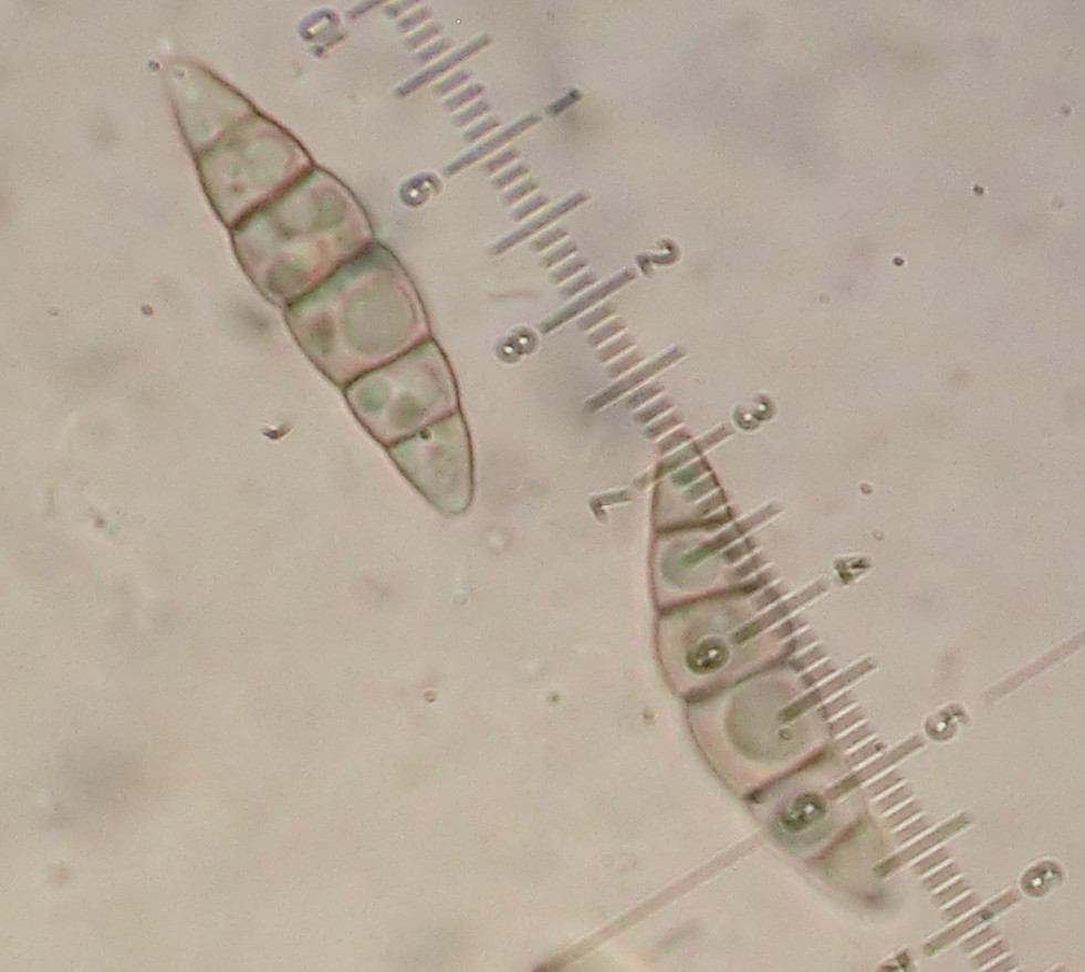 Sporen: blass bräunlich, 26 - 32 x 6 -7,5 µm, 5fach septiert, mit großen Tropfen in den Zellen