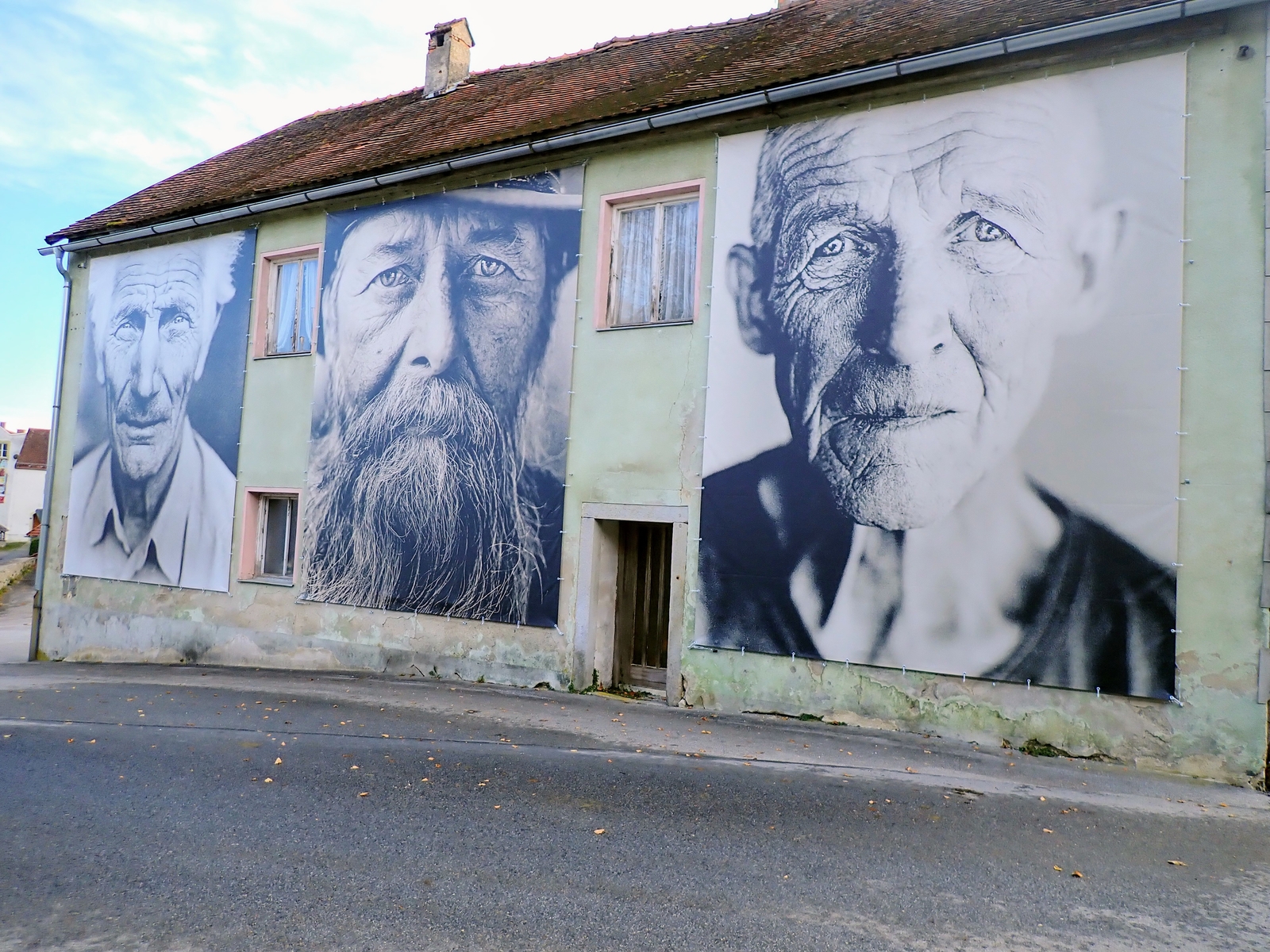 So etwas ist mir vorher noch nicht unter gekommen. Zuerst fand ich es etwas irritierend. Doch bei näherer Betrachtung faszinierten mich die Gesichter mehr und mehr. Da diese an einem alten Haus der Straße zugewandt und somit der Öffentlichkeit zugänglich angebracht sind, gehe ich davon aus, dass ich ein Bild davon hier posten darf.