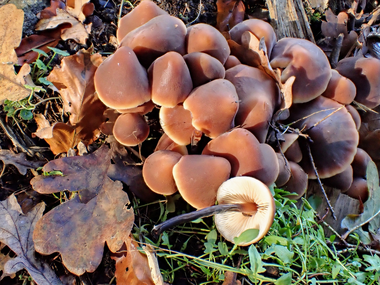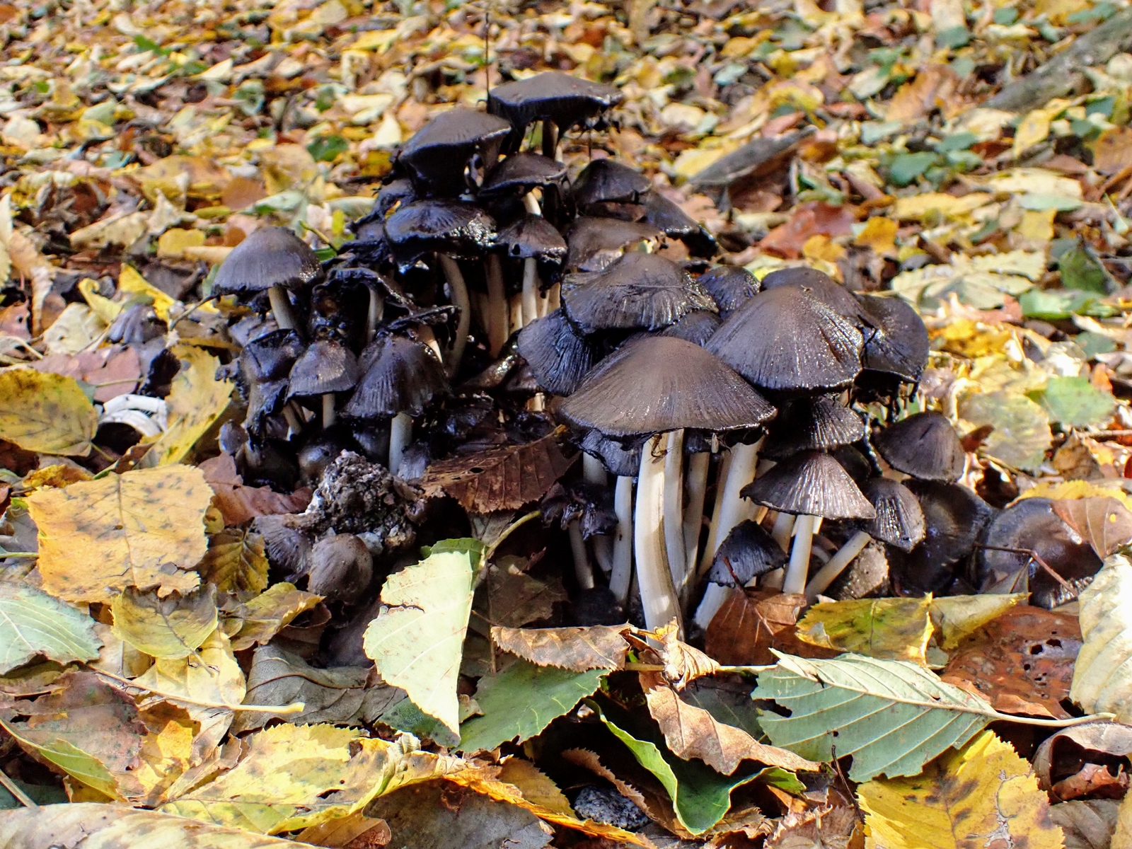 Eine Truppe Tintlinge tintet fröhlich vor sich hin. Jeglicher Bestimmungsversuch wäre wohl erfolglos verlaufen. Das schöne Gesamtbild, das perfekt zur aktuellen Jahreszeit passt, wollte ich sowieso nicht zerstören.