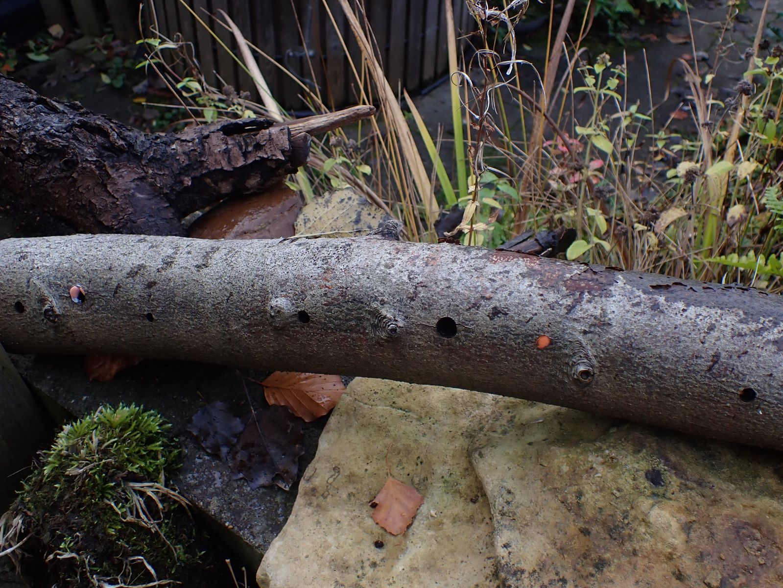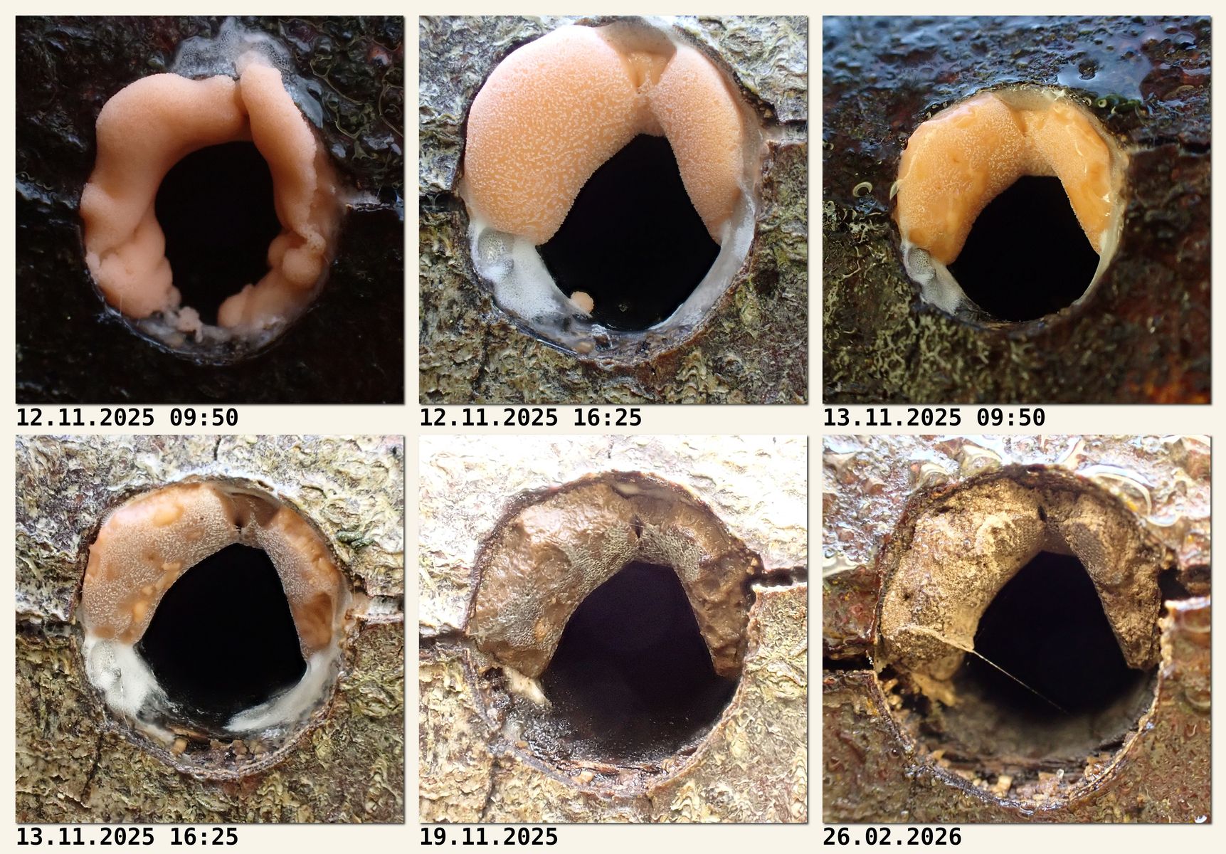 letztes Jahr konnte ich an einem Buchenast im Garten einen Schleimpilz beobachten. Er wuchs an mehreren Stellen, in Löchern, und daneben.